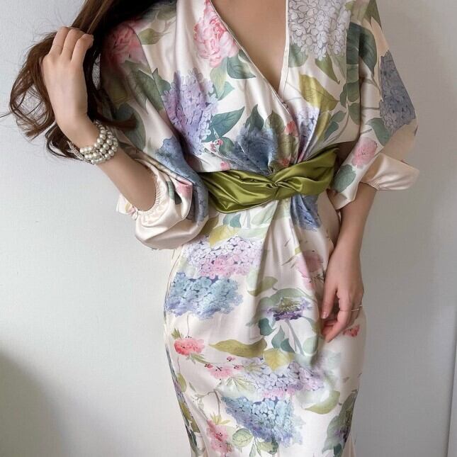 サマーVネックフローラルプリント柄ウェストスリムロングドレス レディース エレガント 夏物 花柄 7/20 mi4623041150650