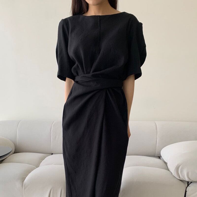 サマーラウンドネックバンドバックスリットロングドレス レディース エレガント 夏物 Oネック 7/20 mi4616989805803