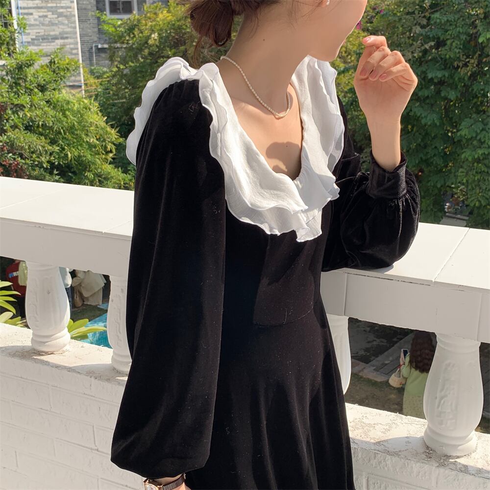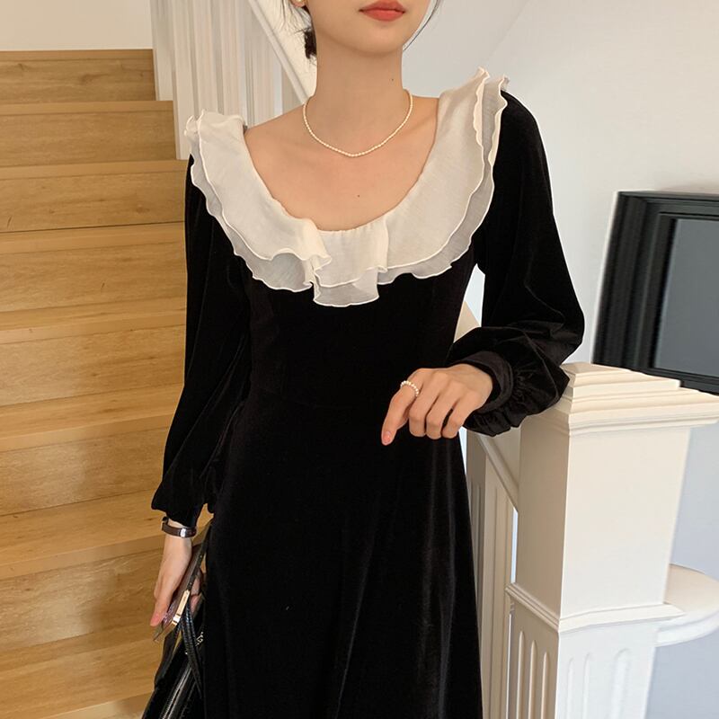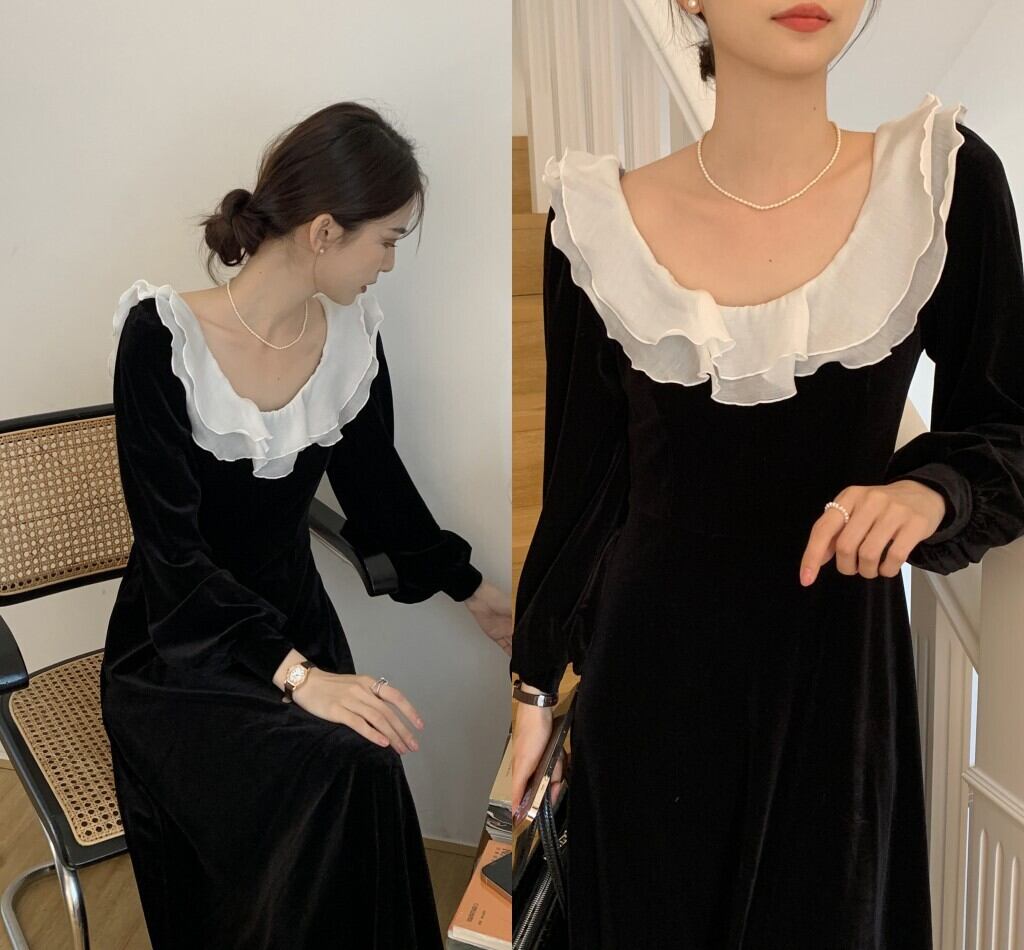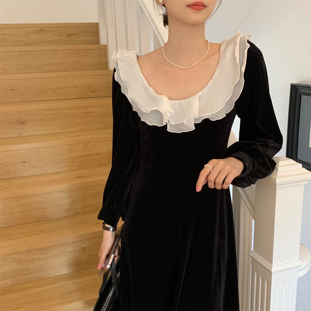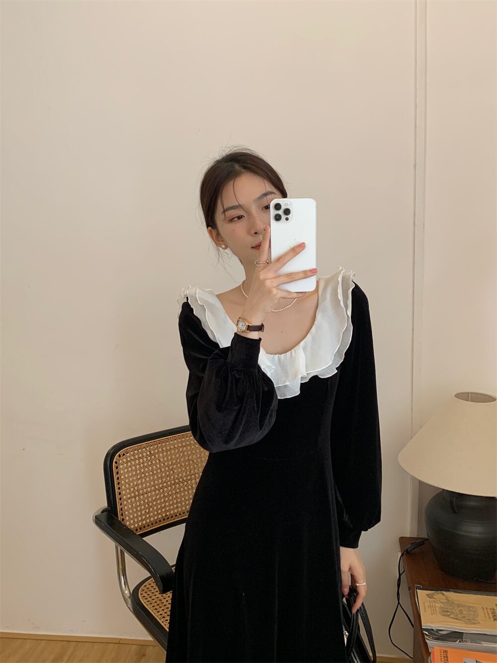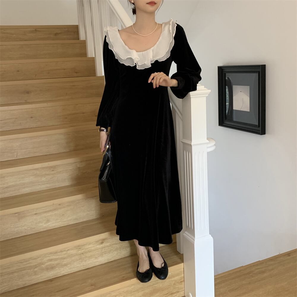 オータムスタンダードウェストスリムベルベットドレス ロング レトロ 秋物 ステッチ 7/20 mi4690745739554