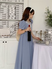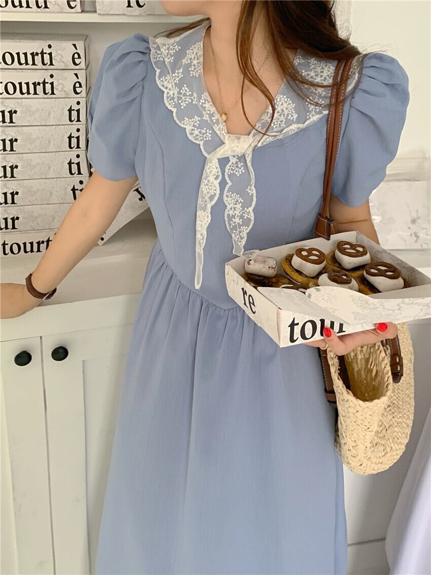 サマーブルーVネックレーススリーブドレス 夏物 ステッチ 7/20 mi4696440859132