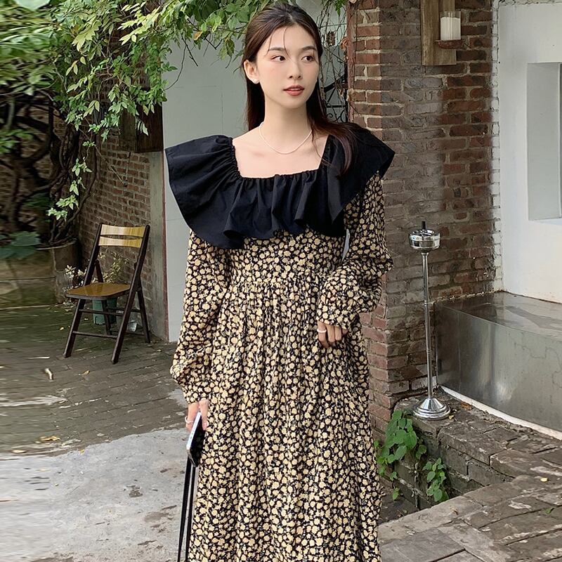 オータムスタンダードカラーウェスト薄手フローラルドレス ロング レトロ 秋物 花柄 スクウェア ステッチ 7/20 mi4690158125882