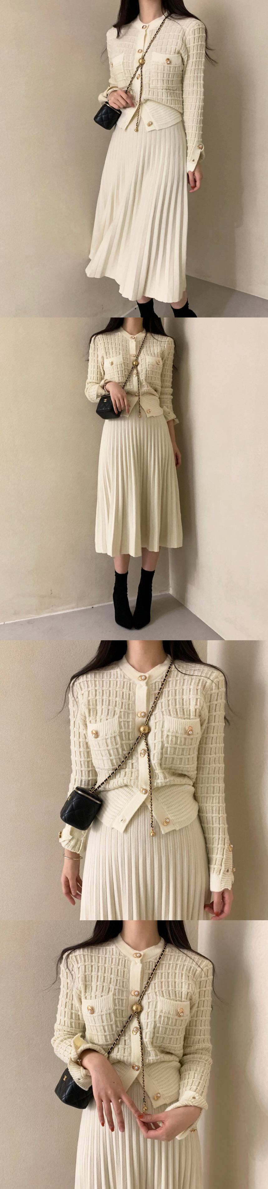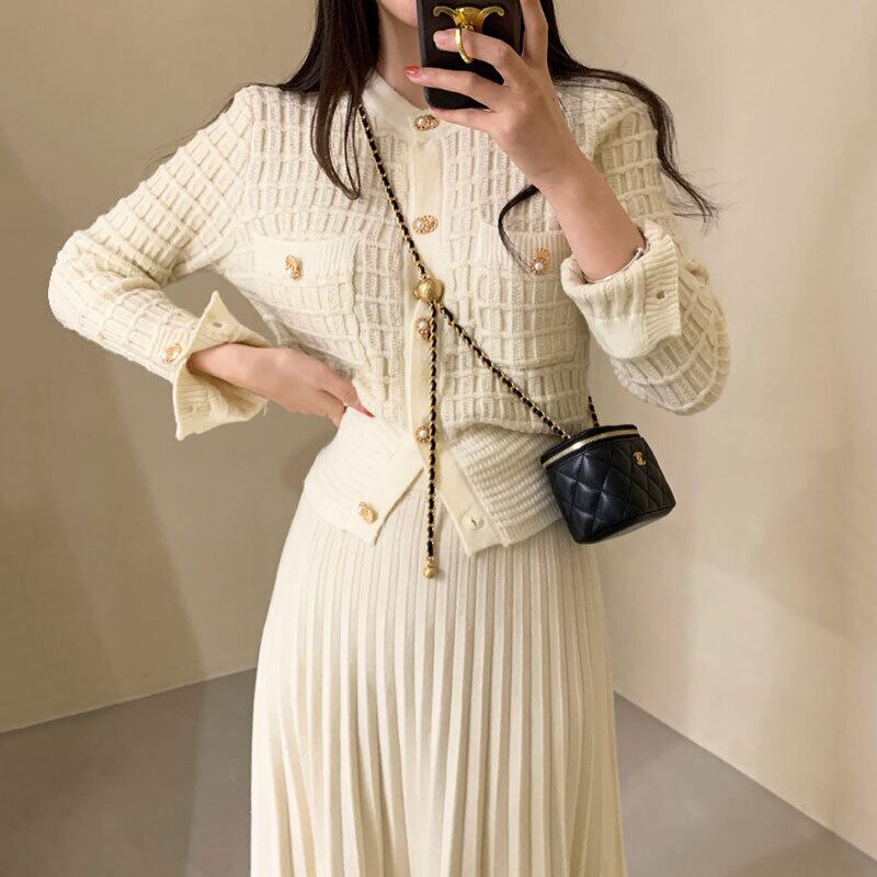 ラウンドネック長袖スリーブニットカーディガンハイウェストウェストプリーツスカート ロング Oネック 7/20 mi4648482559144