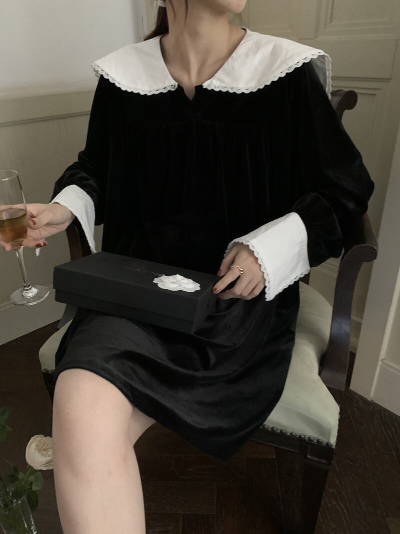 オータムスタンダードネイビーカラーレーススリーブベルベットドレス レディース レトロ エレガント 秋物 ステッチ 7/20 mi4641584237345