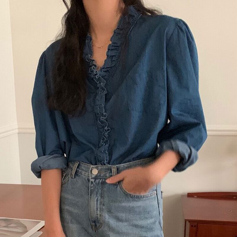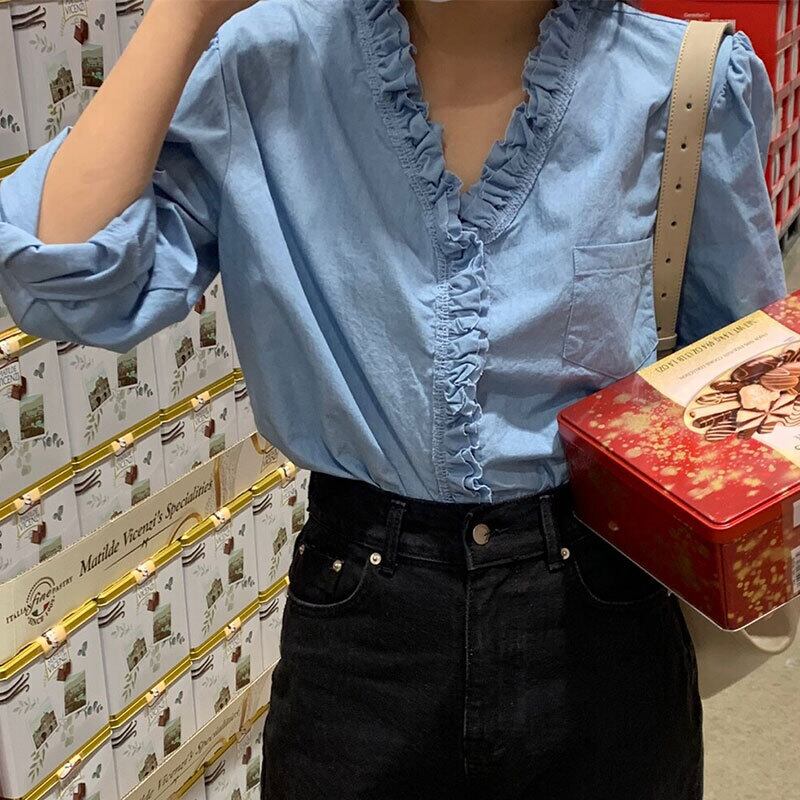 オータムスタンダードVネックブルーシャツ トップス ロング レトロ 秋物 ステッチ 7/20 mi4628054659229