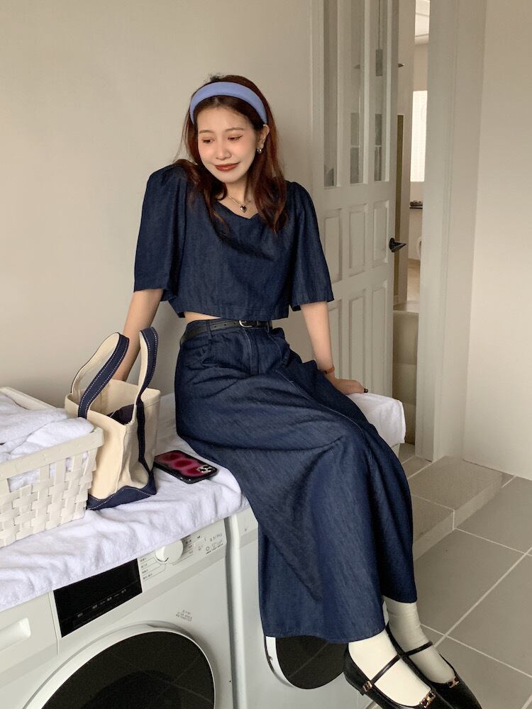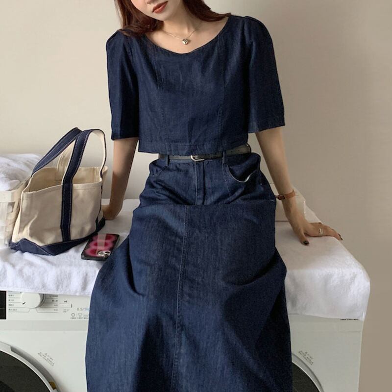 サマーラウンドネックルーズショートシャツ ハイウェストウェストスカート ベルト レディース 夏物 ハーネス Oネック 7/20 mi465135819870