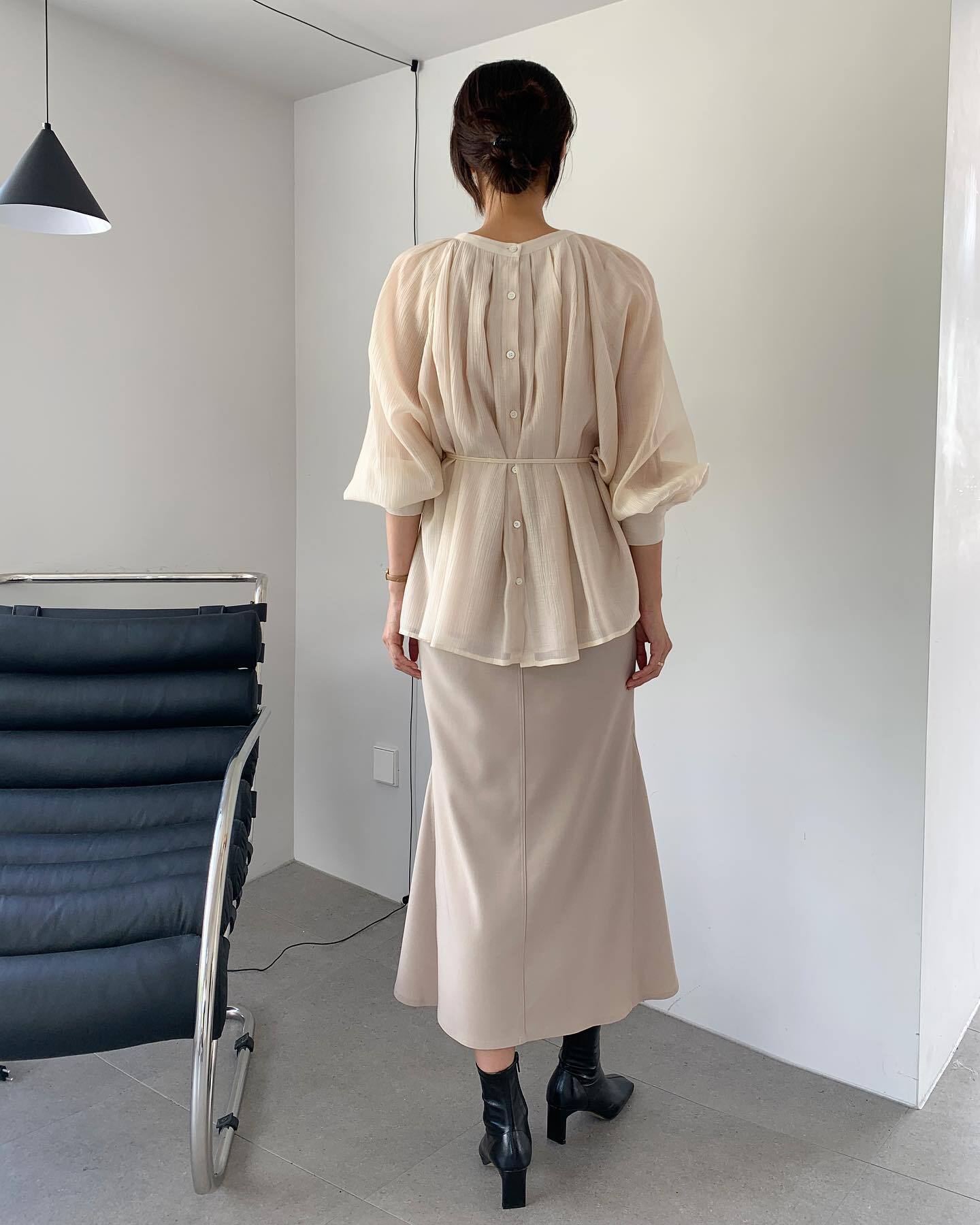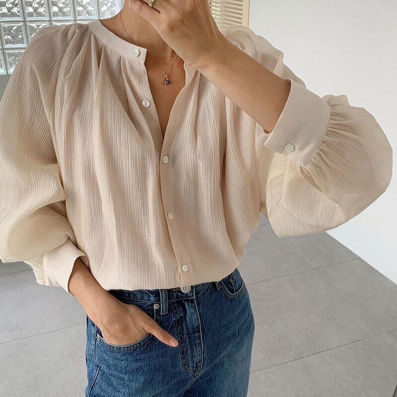 オータムラウンドネックバックプリーツウェストスリーブシャツ トップス 秋物 Oネック 7/20 mi466055490832