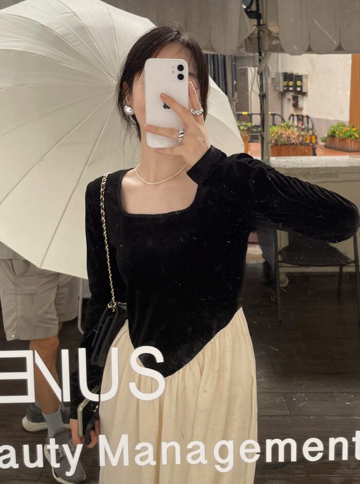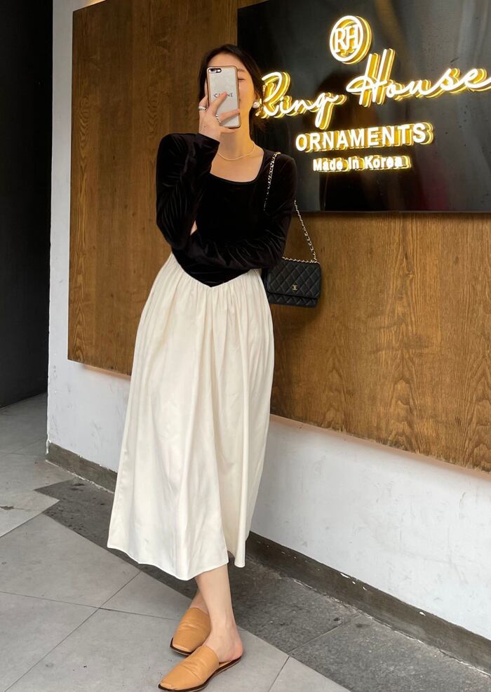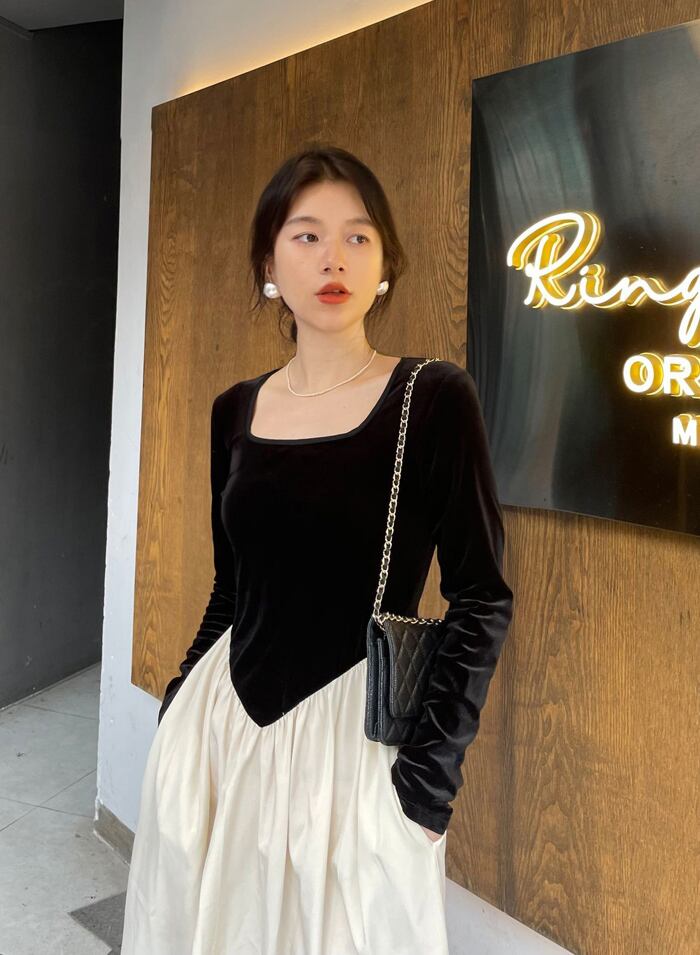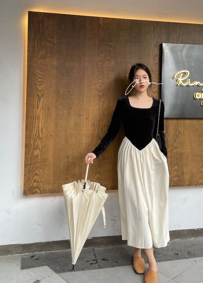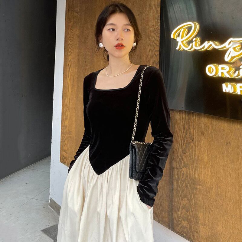 オータムカラーベルベットドレス ロングスカート レディース 秋物 スクウェア ステッチ 7/20 mi463546990015