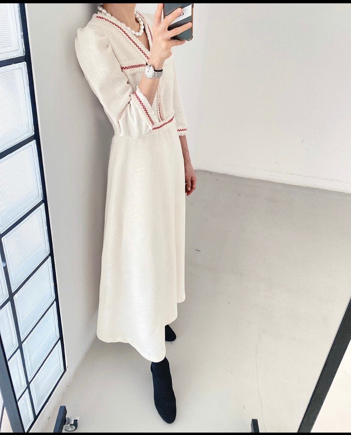 スタンダードVネックカラーウェストスリムロングツィードドレス レディース レトロ 7/20 mi4661256973643