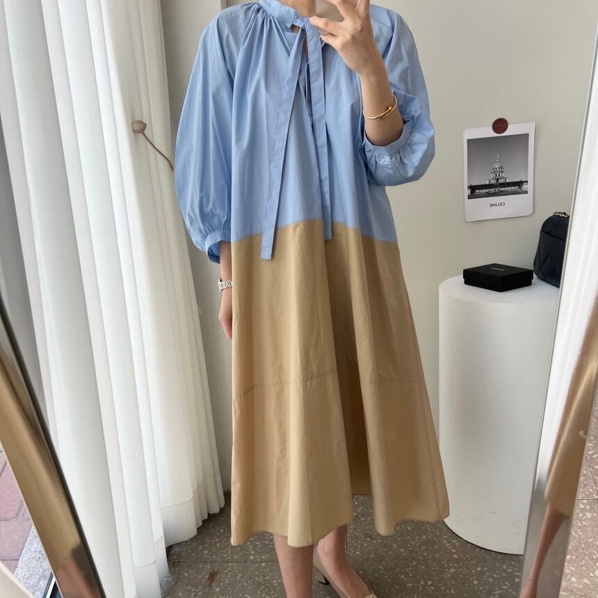 オータムスタンダードレースラウンドネックカラールーズカジュアルドレス ロング レトロ 秋物 Oネック ステッチ 7/20 mi4694902569583