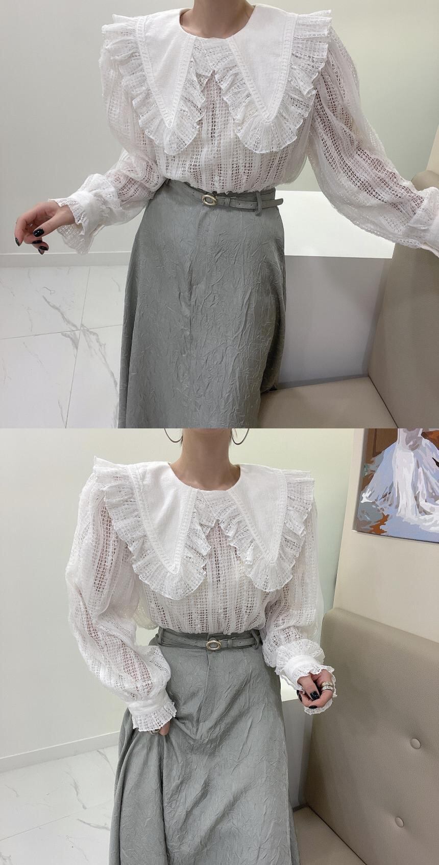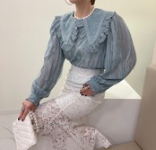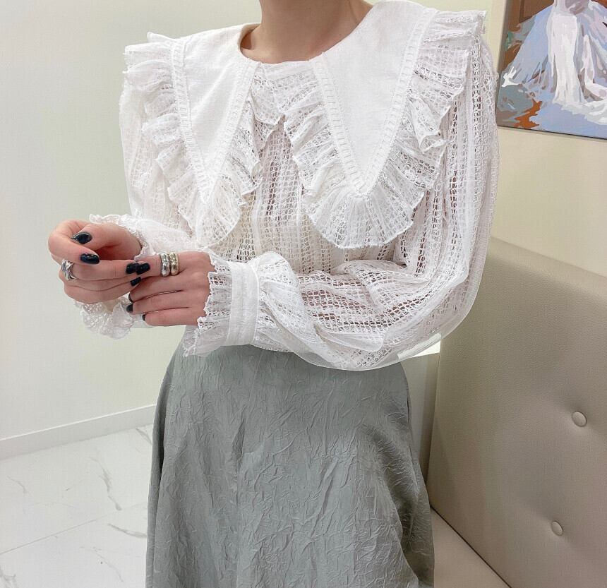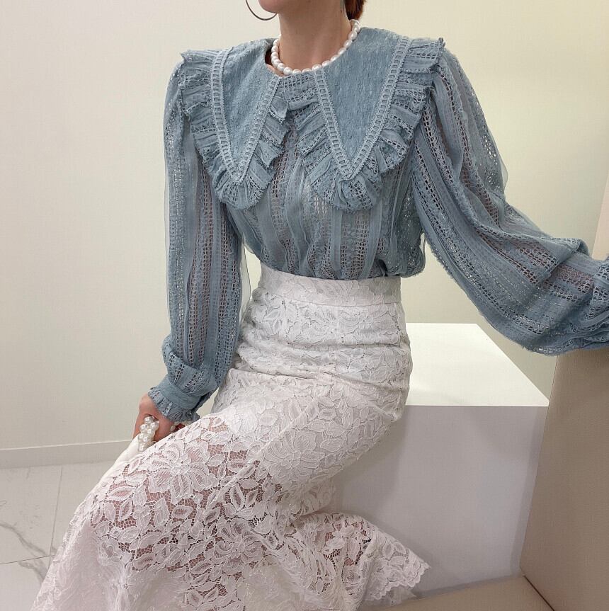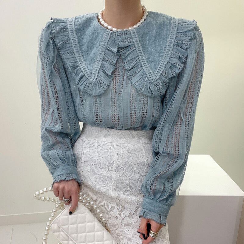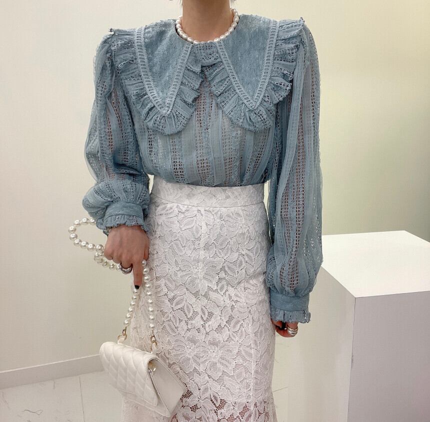 スタンダードカラーレースFlowerデザイン シャツ トップス レディース ロング レトロ エレガント フラワーデザイン ステッチ 7/20 mi4695589663679