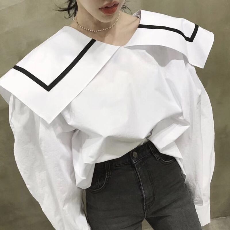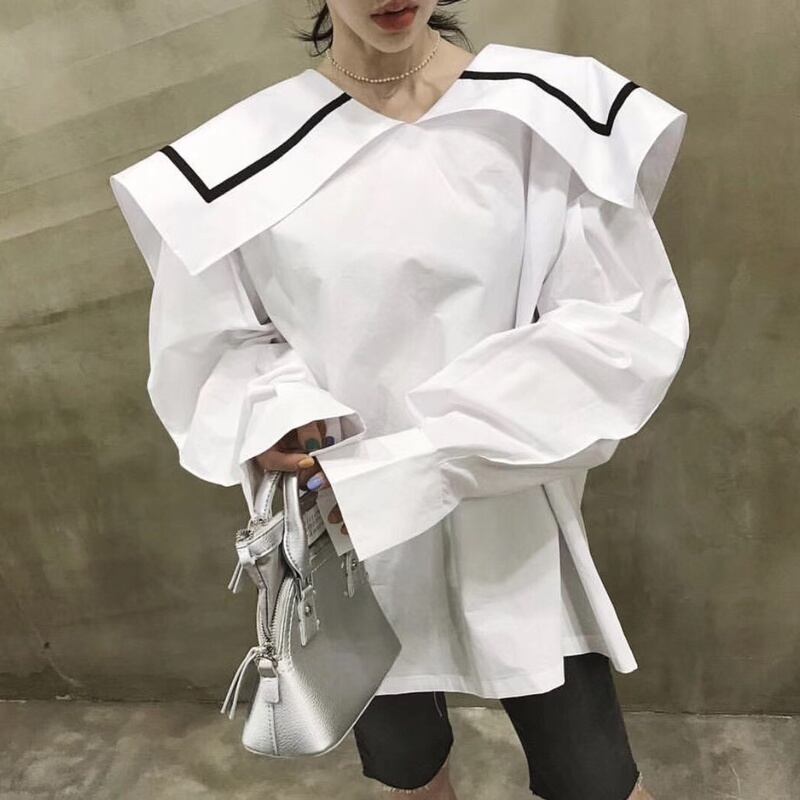 オータムスタイルネイビーカラールーズカジュアルシャツ トップス レディース ロング 秋物 7/20 mi4619179112531