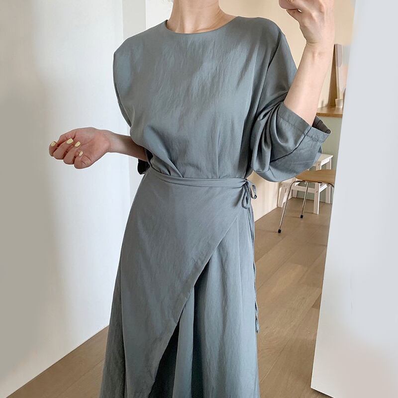 オータムスタンダードラウンドネックレースウェスト薄手ドレス ロング レトロ 秋物 Oネック 7/20 mi4663558199193