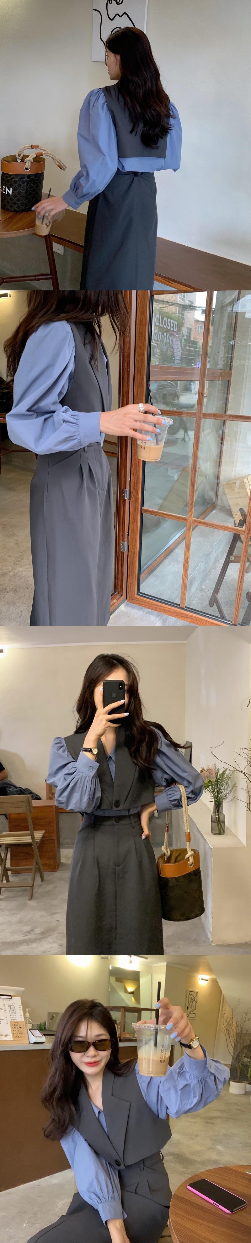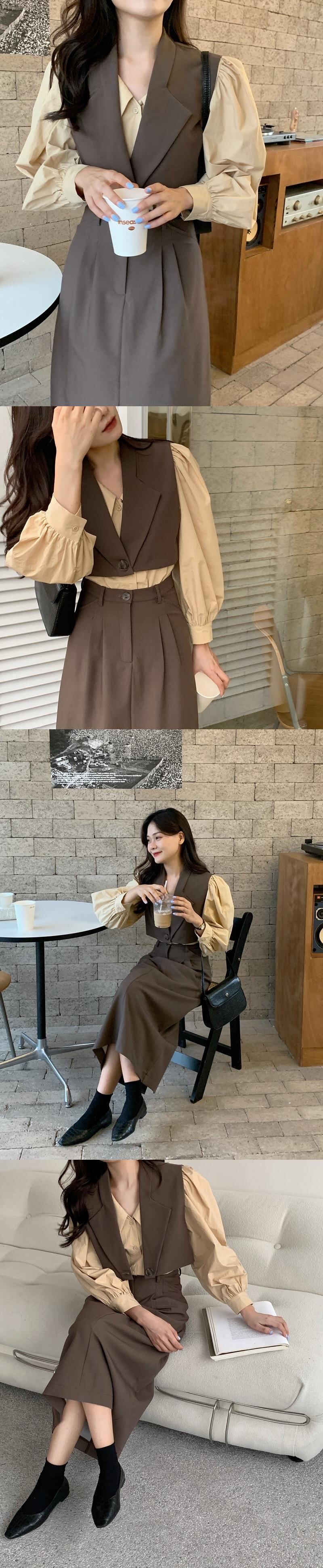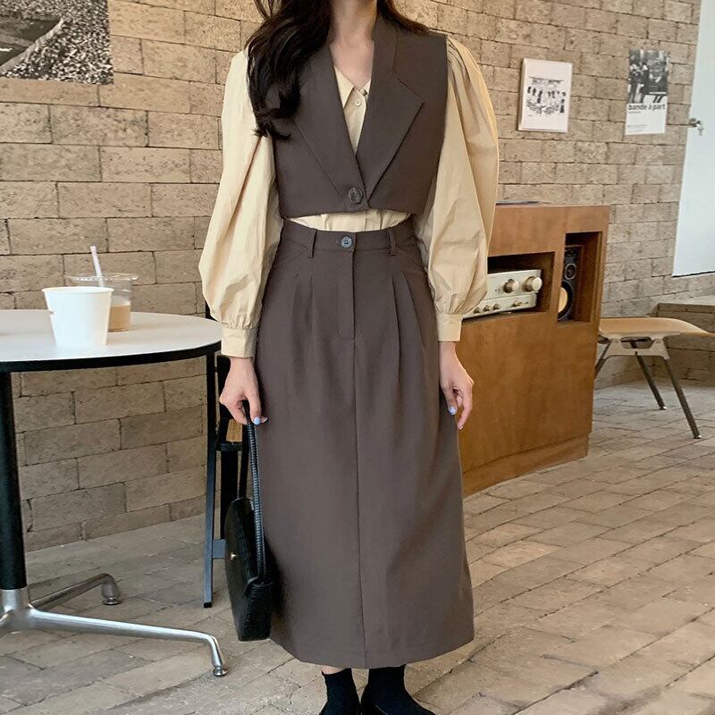 色:カーキ色のシャツ,フォグブルーシャツ,グレーのベスト,グレーのスカートサイズS,グレーのスカートサイズM,ブラウンベスト,ブラウンスカートサイズS,ブラウンスカートMサイズ
