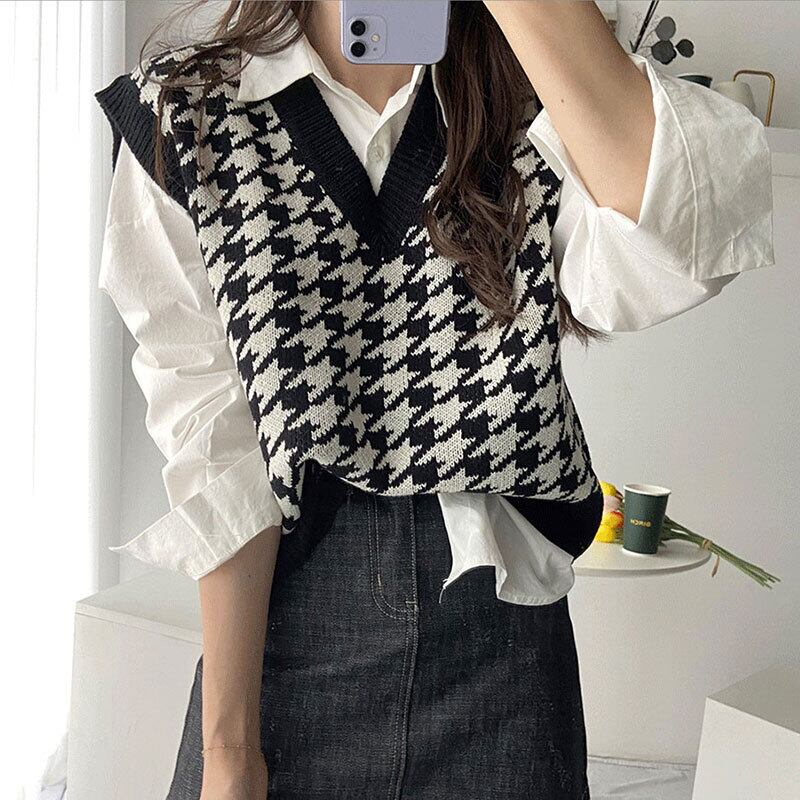 オータムスタンダードVネックジャカードルーズカジュアルノースリーブニットレディース レトロ 秋物 7/20 mi4689266291551