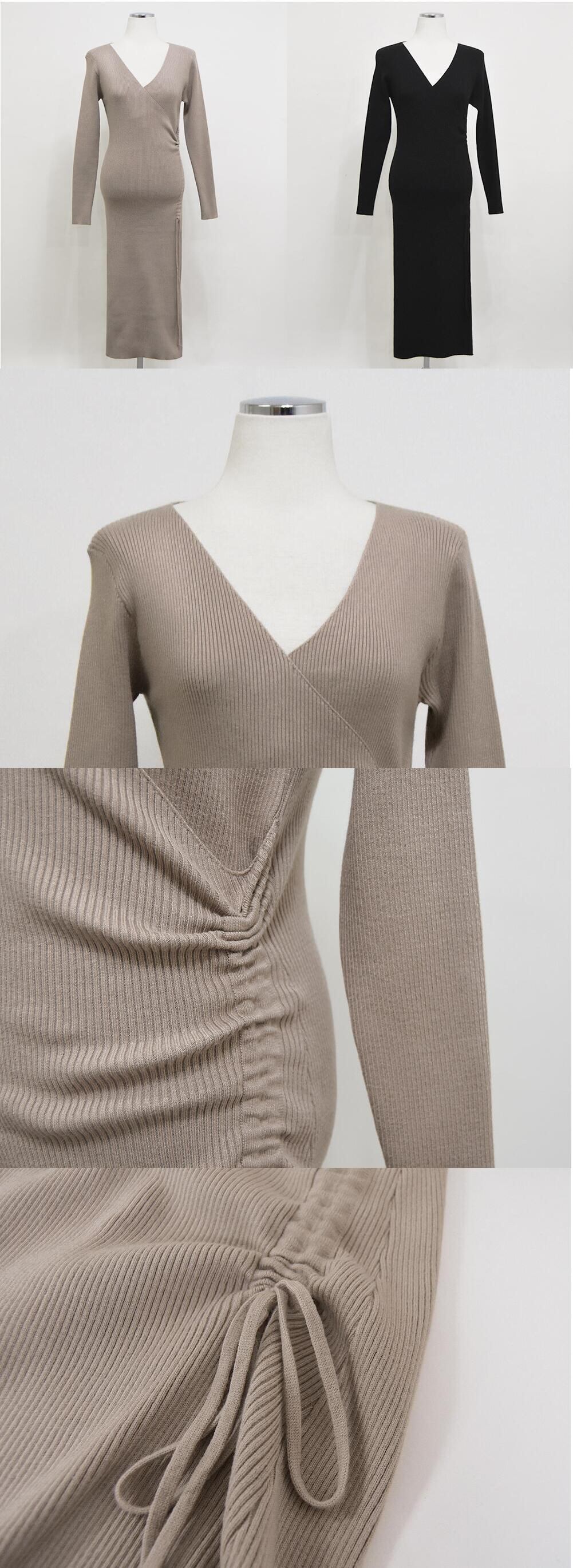 Vネックギャザーリボンスリムフィットニットドレス ロング オータム 秋物 7/20 mi4659032194626