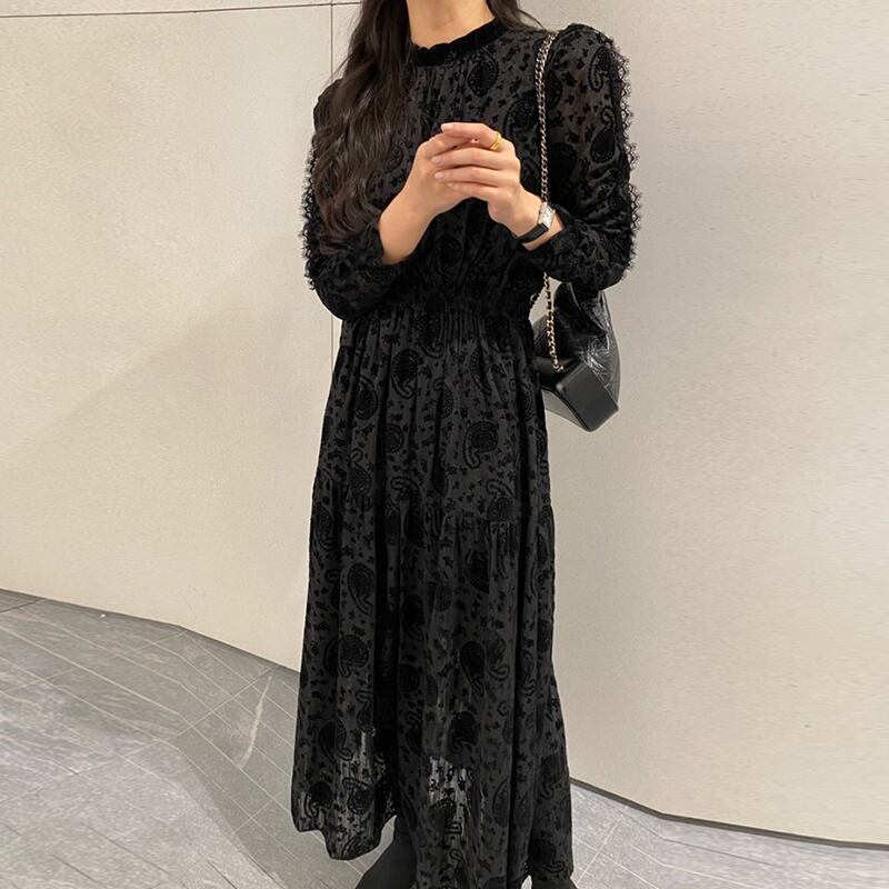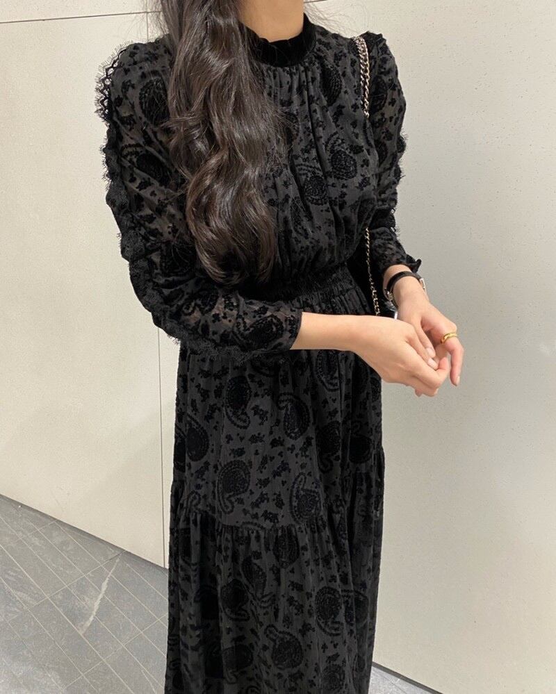 オータムスタンダードラウンドネックレースFlowerデザイン ウェスト薄手ドレス ロング レトロ 秋物 Oネック フラワーデザイン 7/20 mi4681643988143