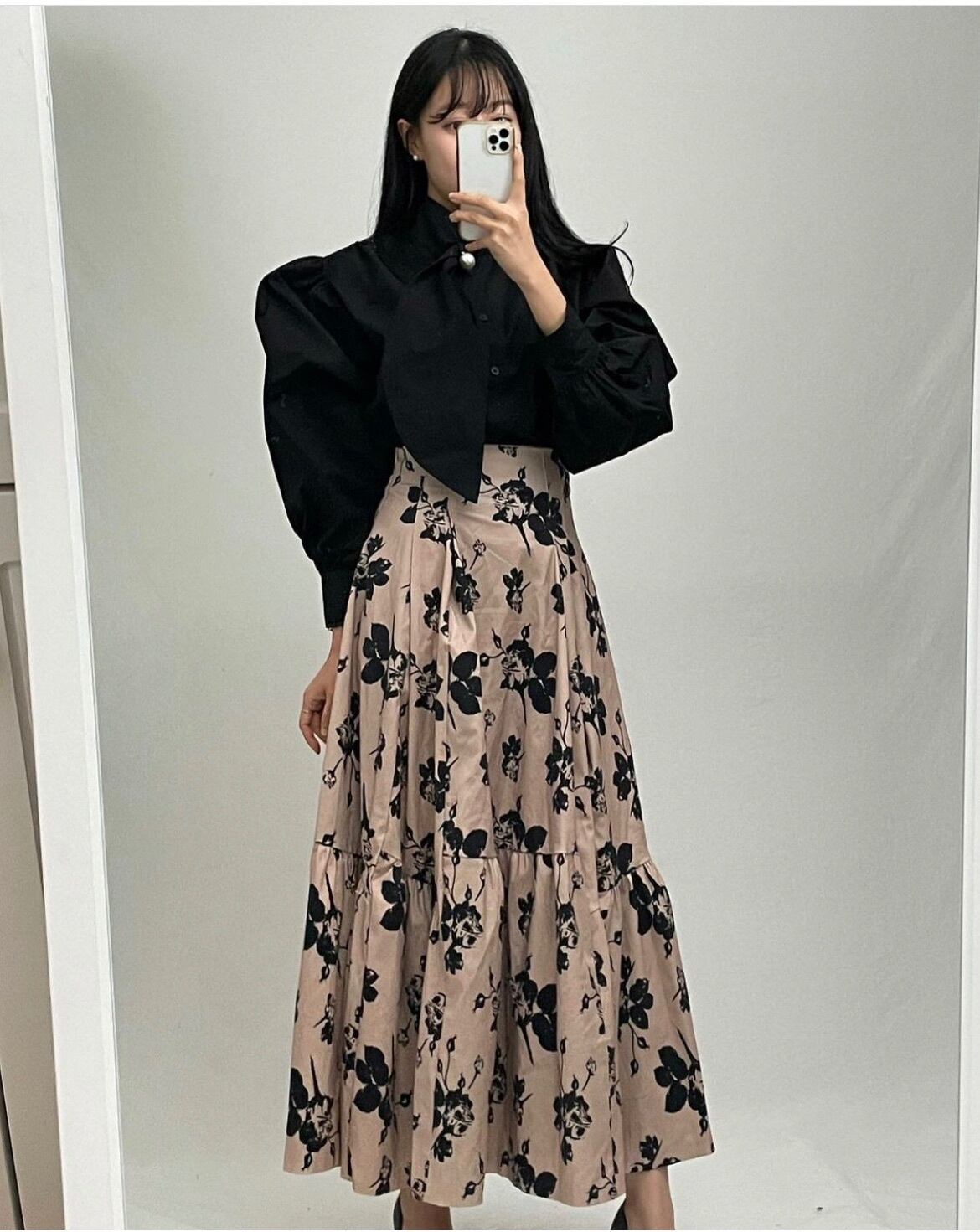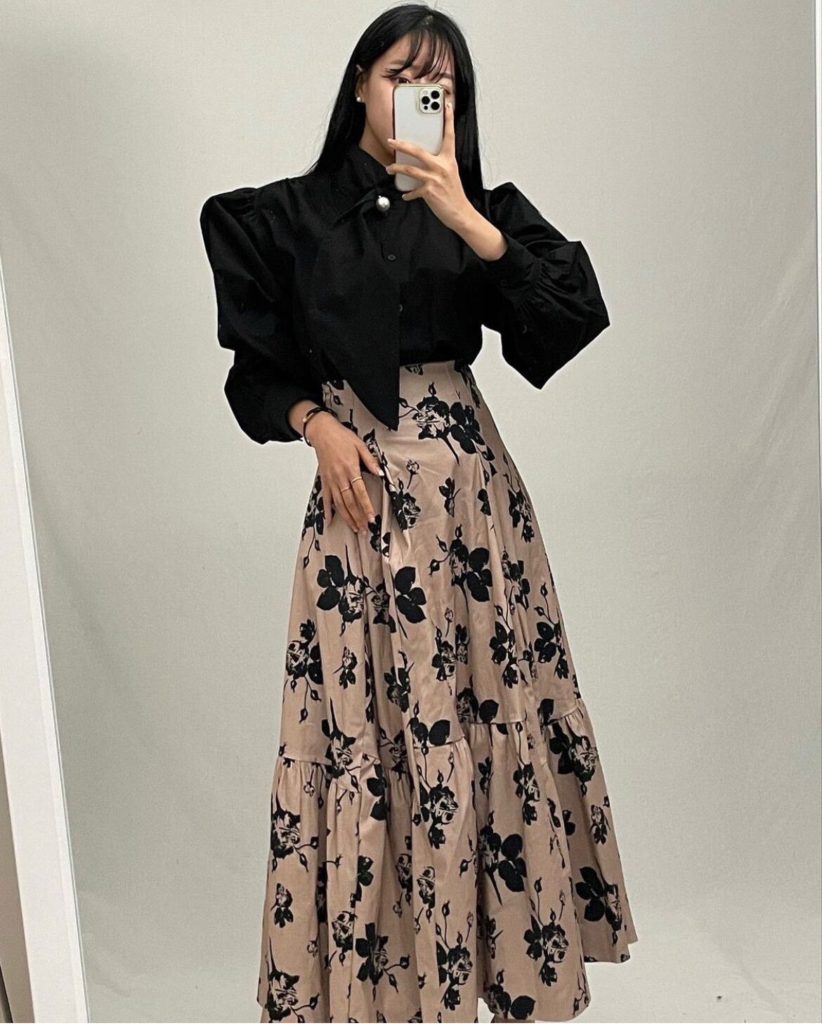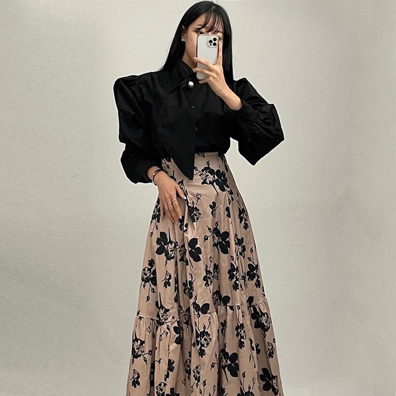 スタンダードスタンドカラーカラースリーブシャツ ハイウェストウェストFlowerデザイン プリント柄スカート レディース レトロ フラワーデザイン 7/20 mi46121455859
