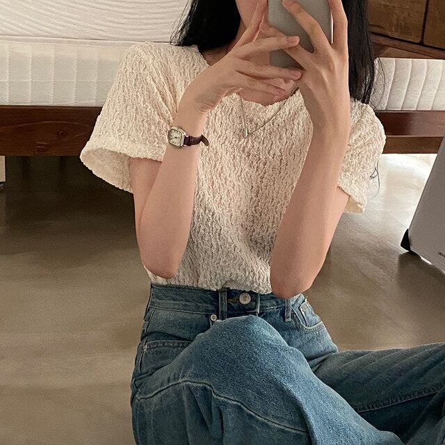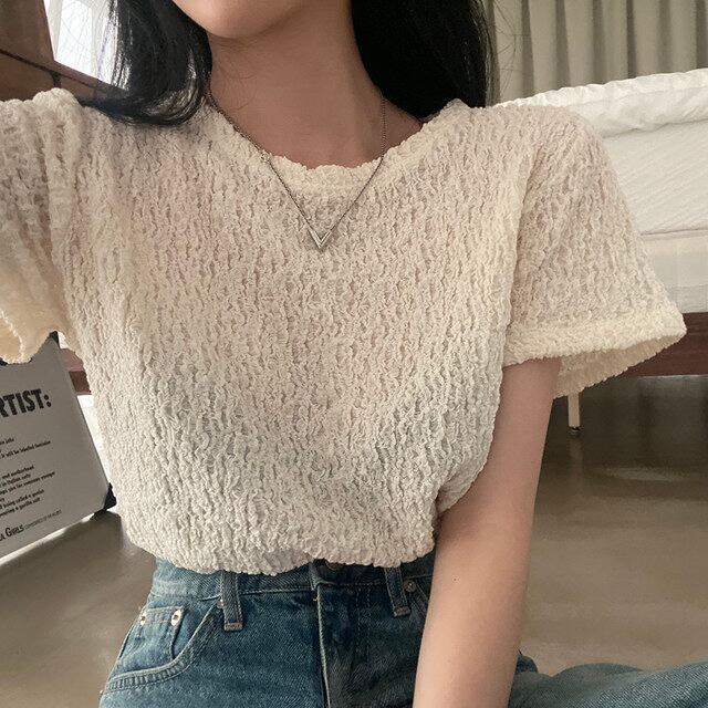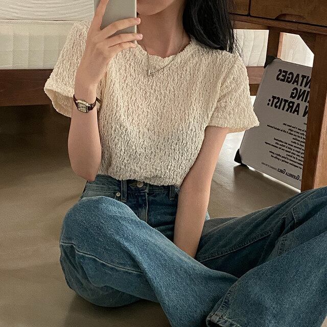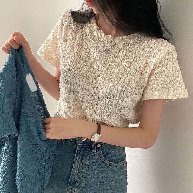 サマーラウンドネックプリーツルーズカジュアルシャツ トップス レディース 夏物 Oネック 7/20 mi4646976711440