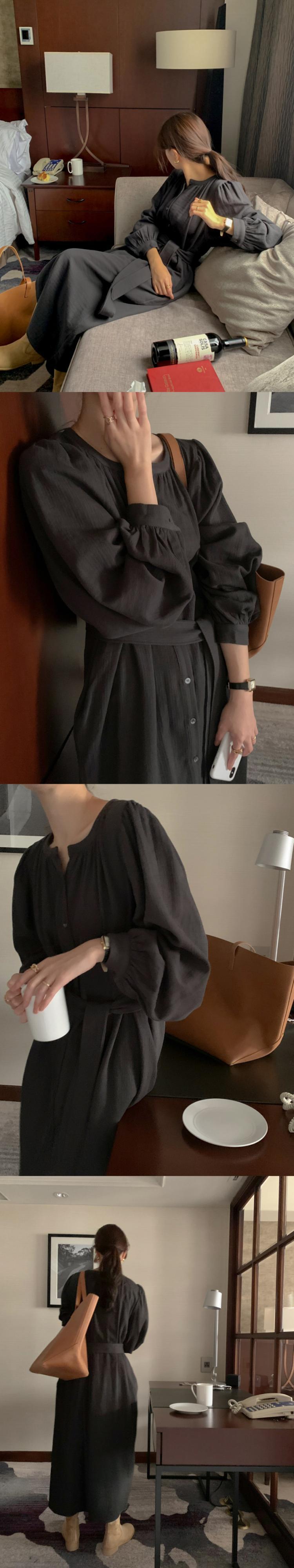 オータムラウンドネックウェストスリットスリーブドレス ランタンスリーブ 秋物 Oネック 7/20 mi466802860449