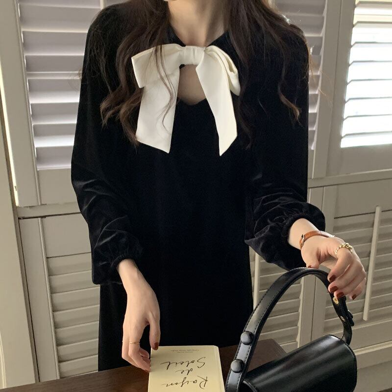 オータムスタンダードカラーリボンスリーブベルベットドレス レディース レトロ 秋物 ステッチ 7/20 mi4646994430158