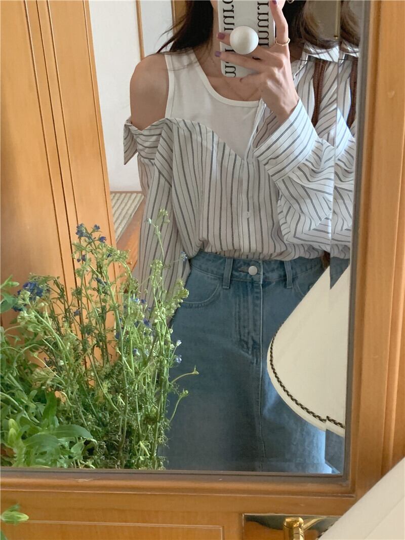 オータムストライプシャツ ロング 秋物 ステッチ 7/20 mi4616590081829