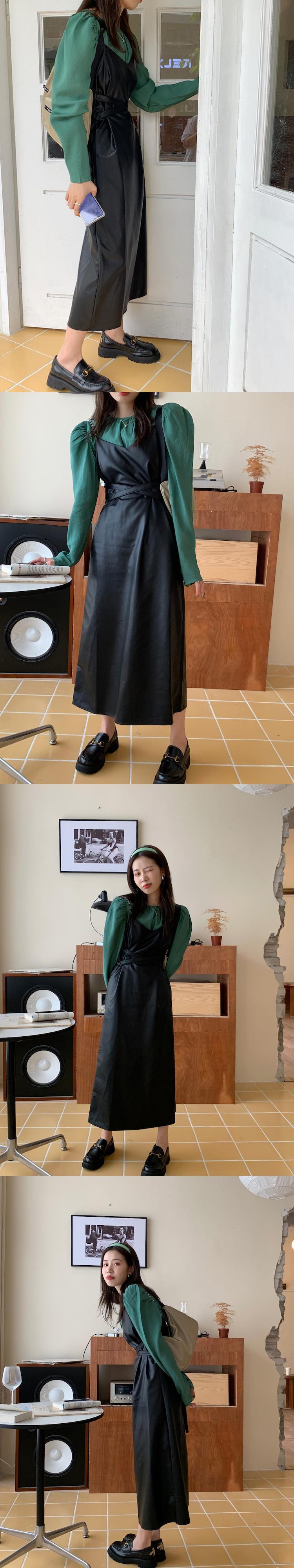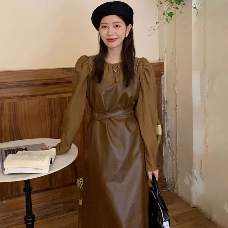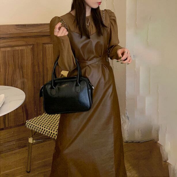 オータムラウンドネックルーズシャツ クロスレザードレス ロング 秋物 Oネック 7/20 mi4673836906186