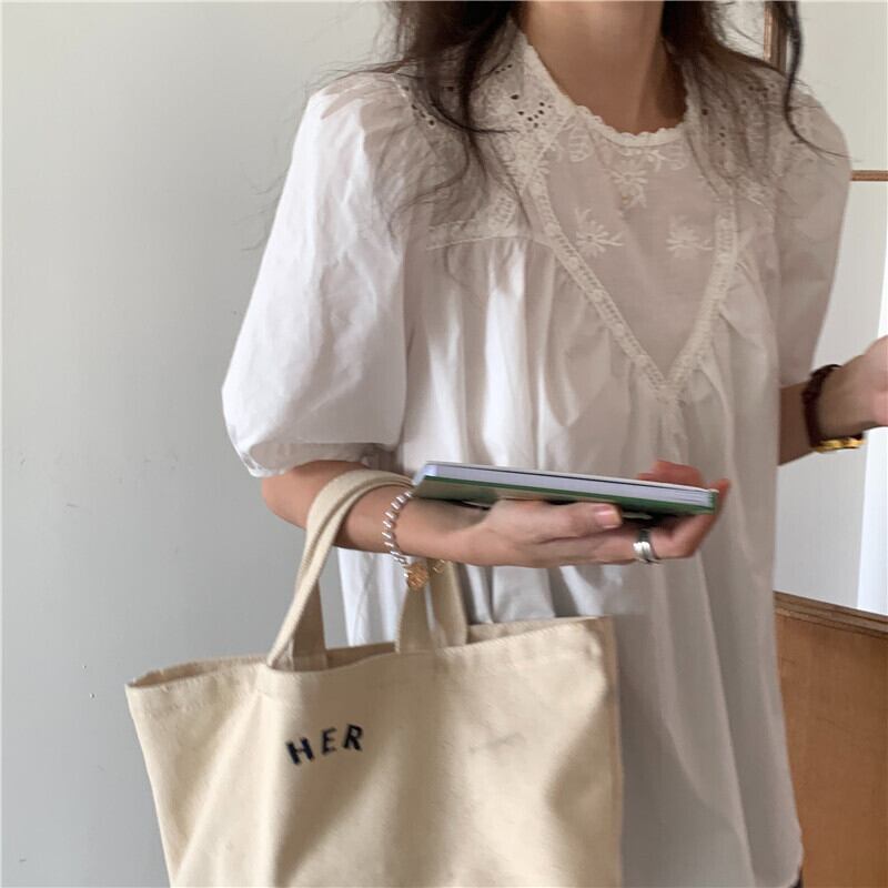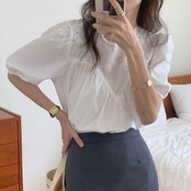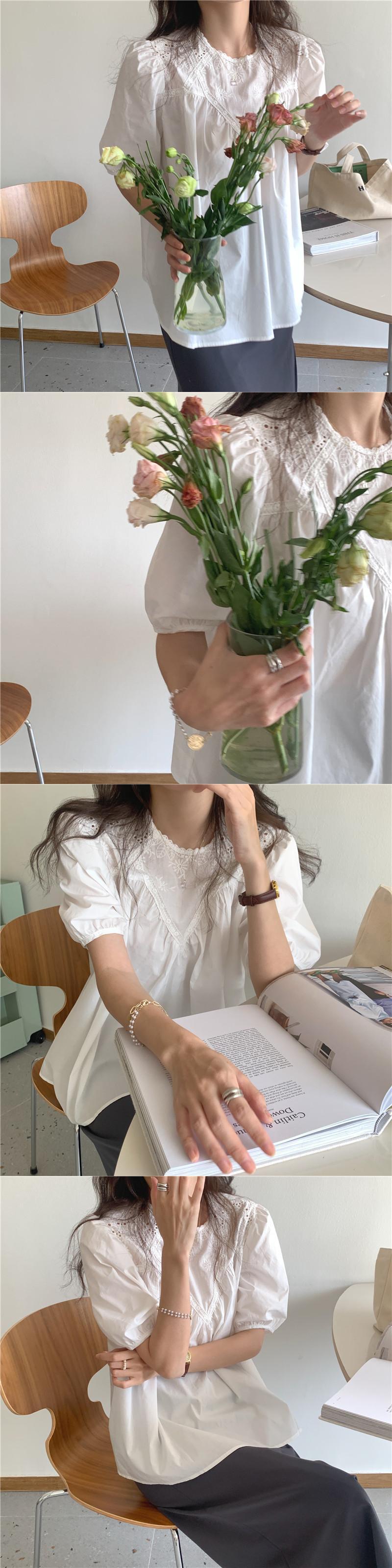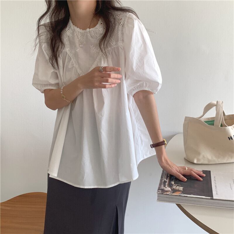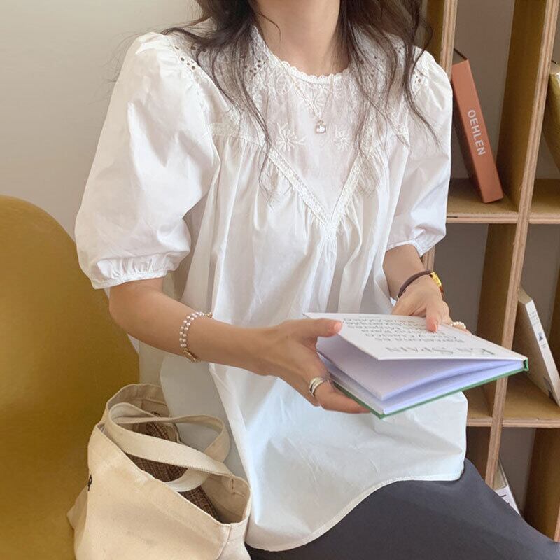 レースラウンドネック刺繍Flowerデザイン スリーブシャツ トップス レディース Oネック フラワーデザイン ステッチ 7/20 mi4624607945285