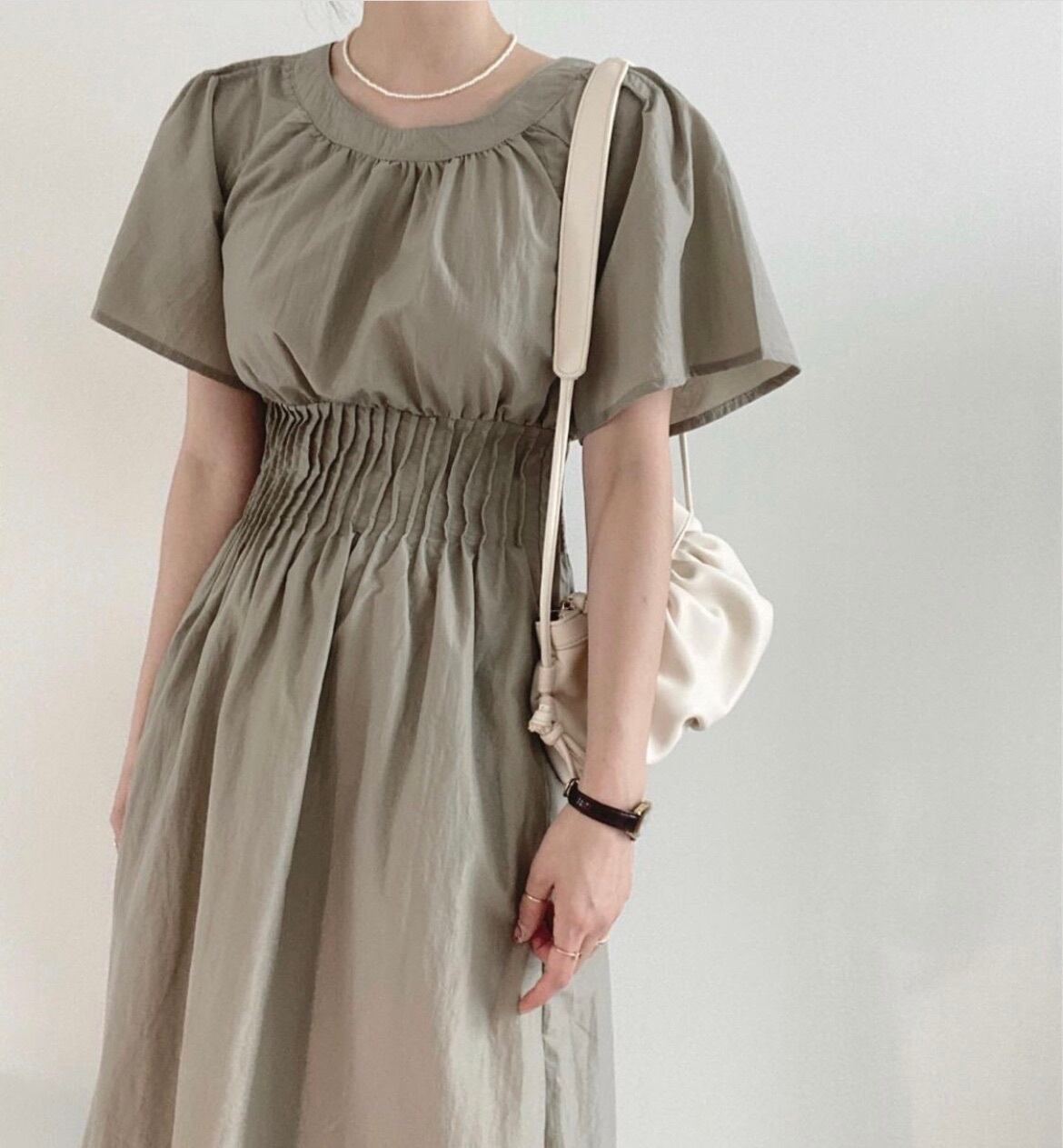 サマースタンダードラウンドネックプリーツウェストスリムスリーブドレス ロングスカート レトロ 夏物 Oネック 7/20 mi4677638346645