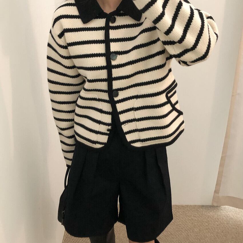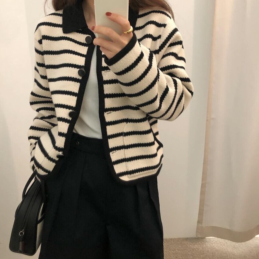 オータムウィンタースタンダードスタイルカラーストライプルーズニットカーディガンセーター レディース ロング レトロ 秋物 冬物 7/20 mi4635215334243