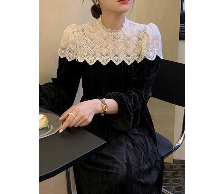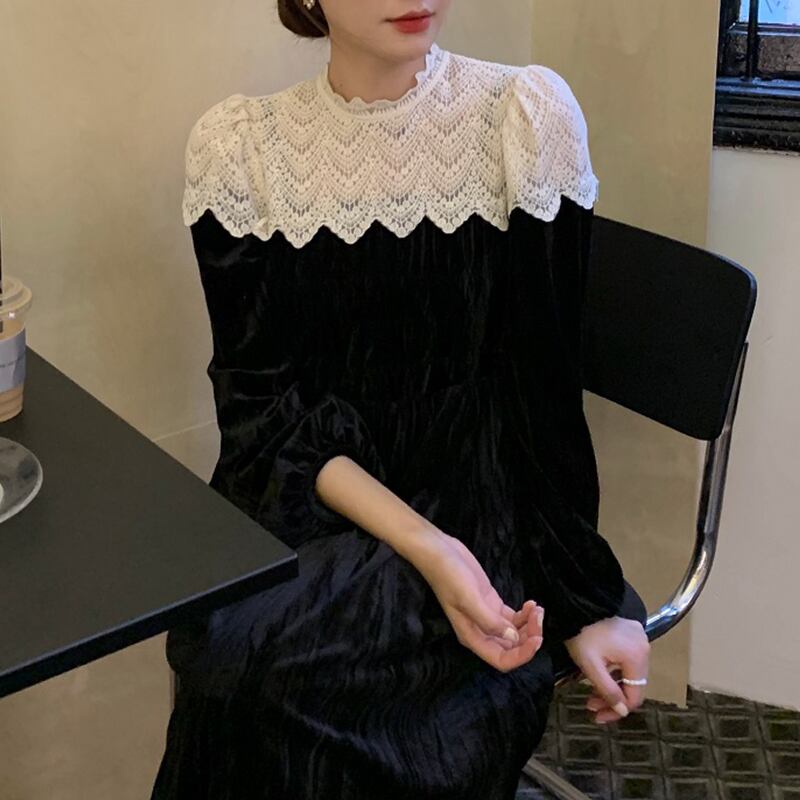 カラーレースFlowerデザイン ウェスト薄手ベルベットドレス レディース ロング エレガント フラワーデザイン ステッチ 7/20 mi4692335962789