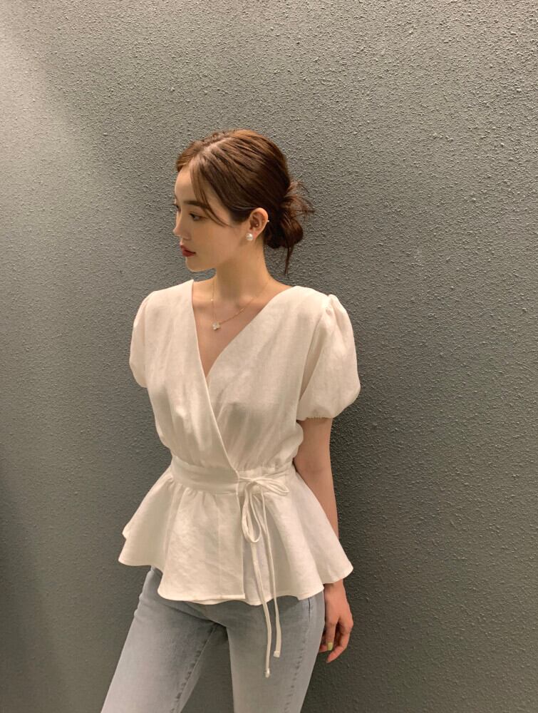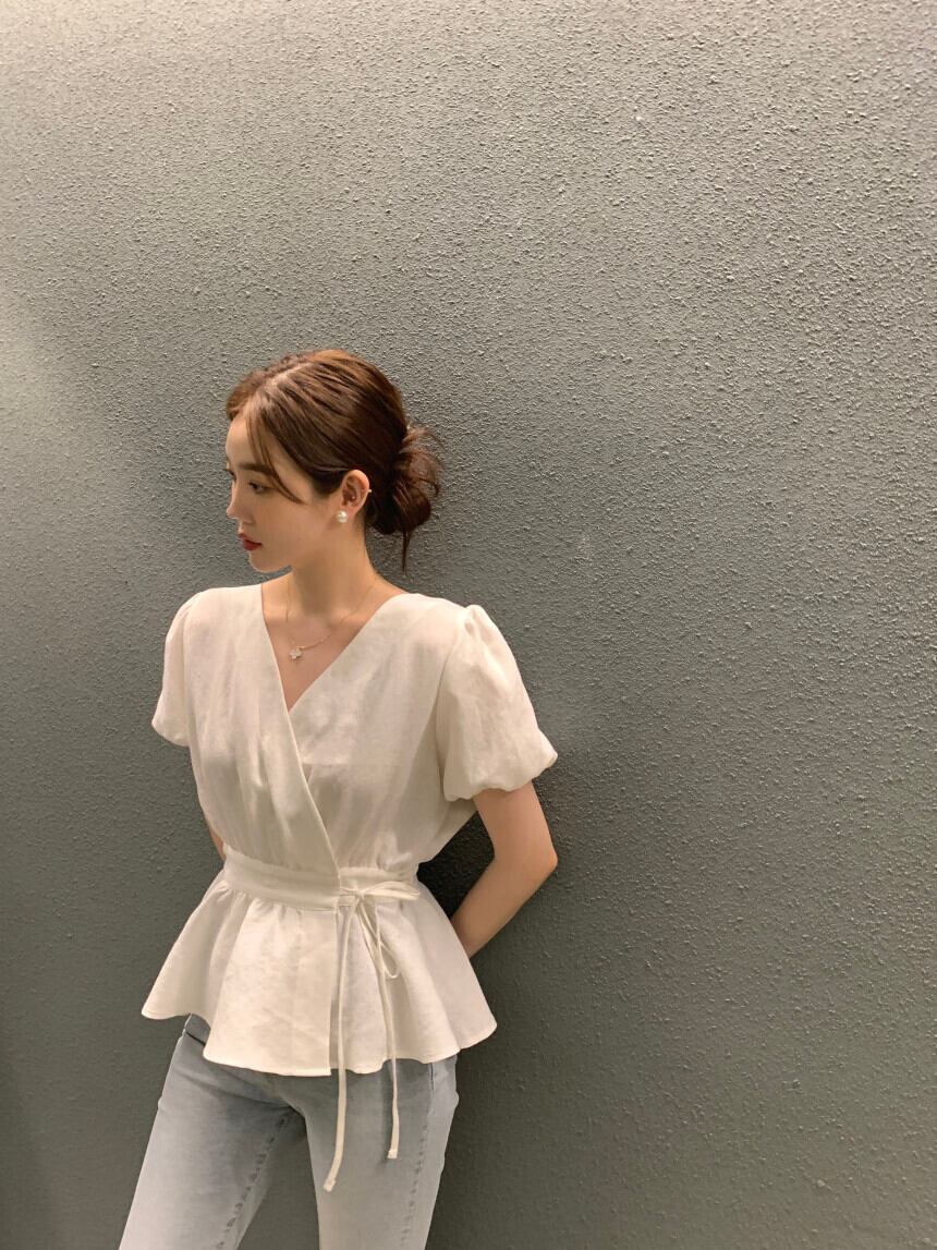 サマースタンダードクロスVネックウェストスリムスリーブシャツ トップス レトロ 夏物 7/20 mi4641687959557