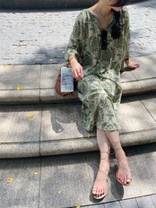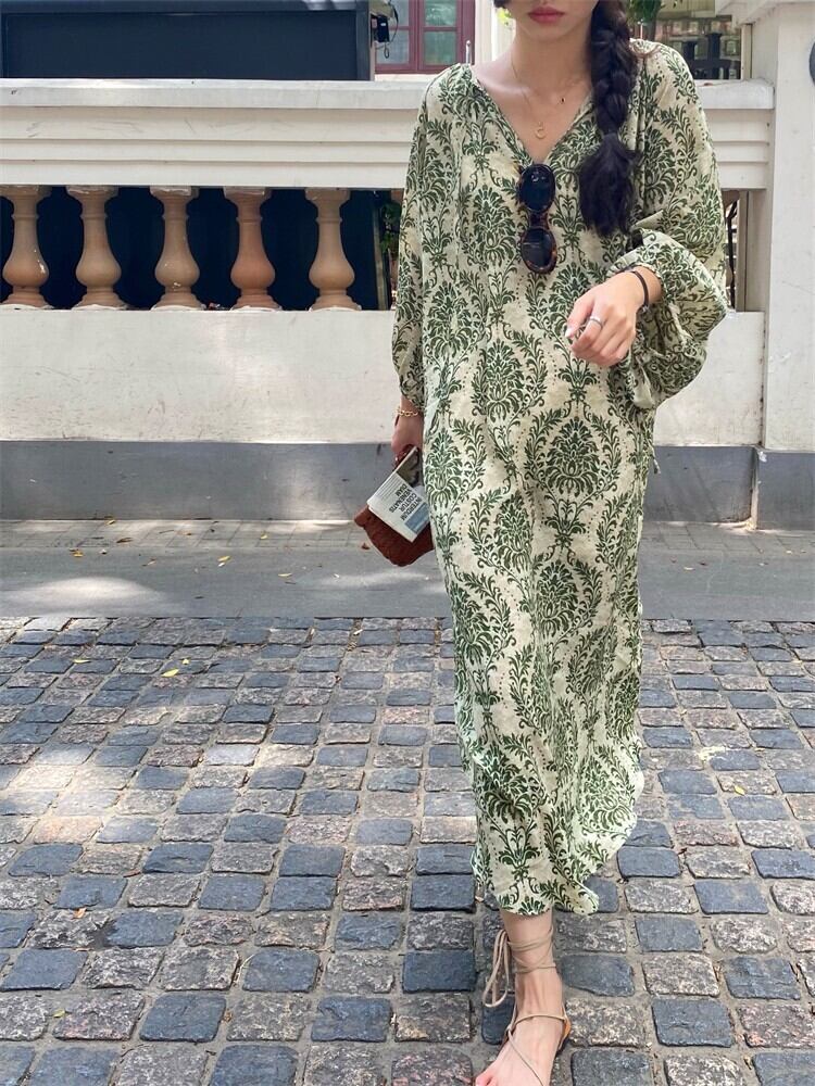 サマーグリーンフローラルスリーブドレス ルーズシフォンスカート ランタンスリーブ 夏物 花柄 9/19 秋冬 オータム ウインター ナチュラル mi4617662317053
