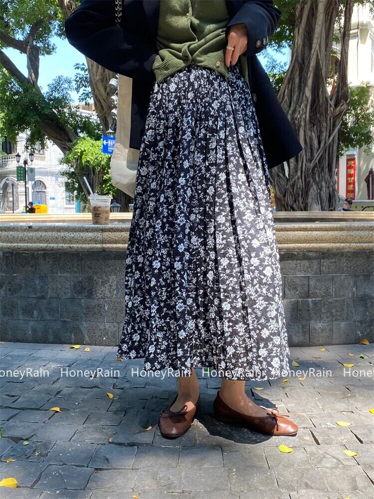 オータムルーズストレッチウェストミディスカート フローラルプリーツレディース エラスティック 伸縮 秋物 花柄 9/19 秋冬 オータム ウインター ナチュラル mi4651978940317