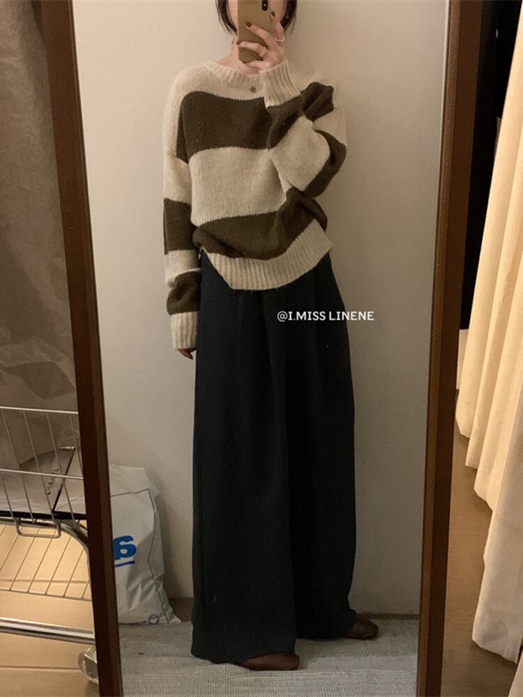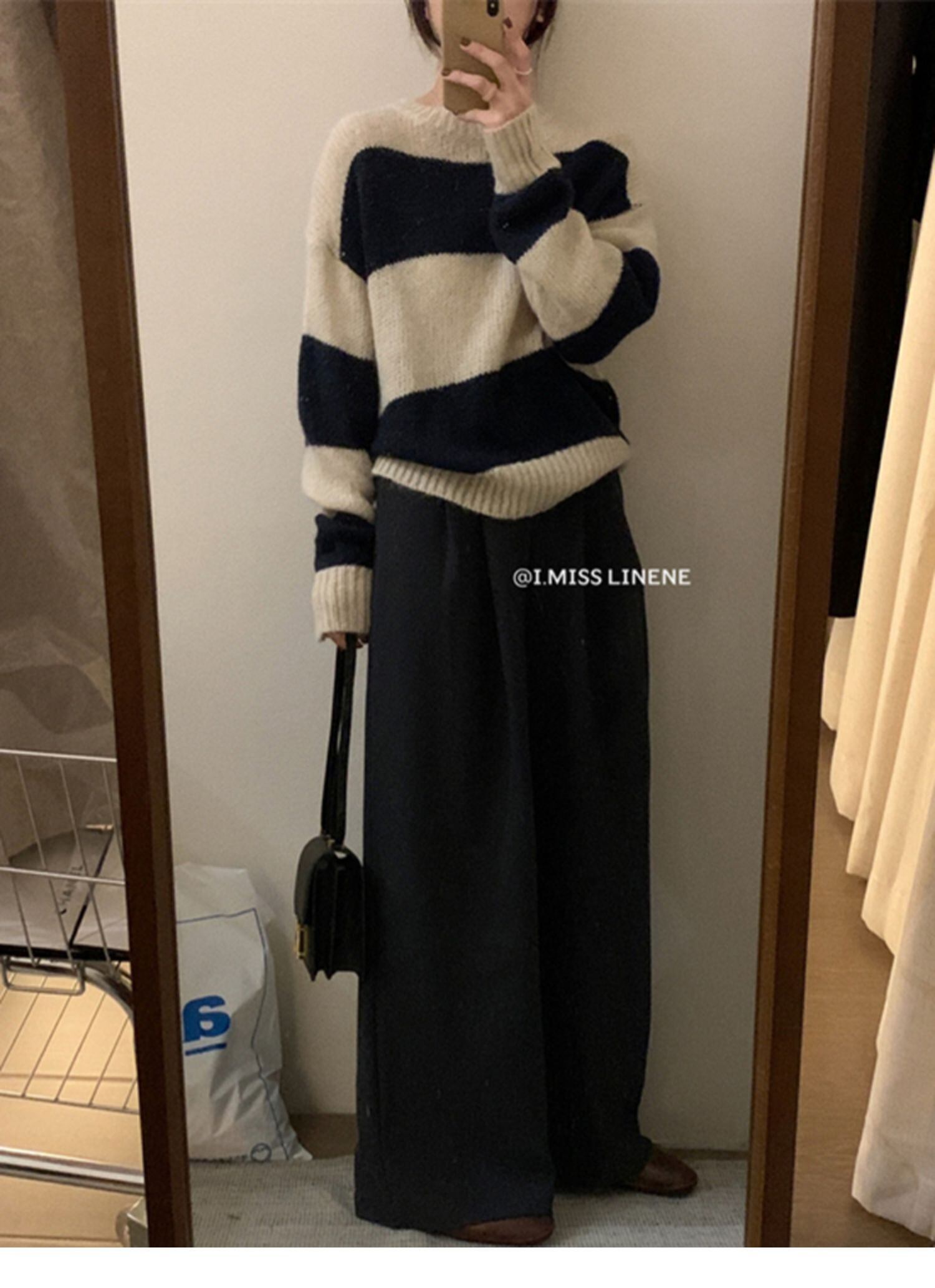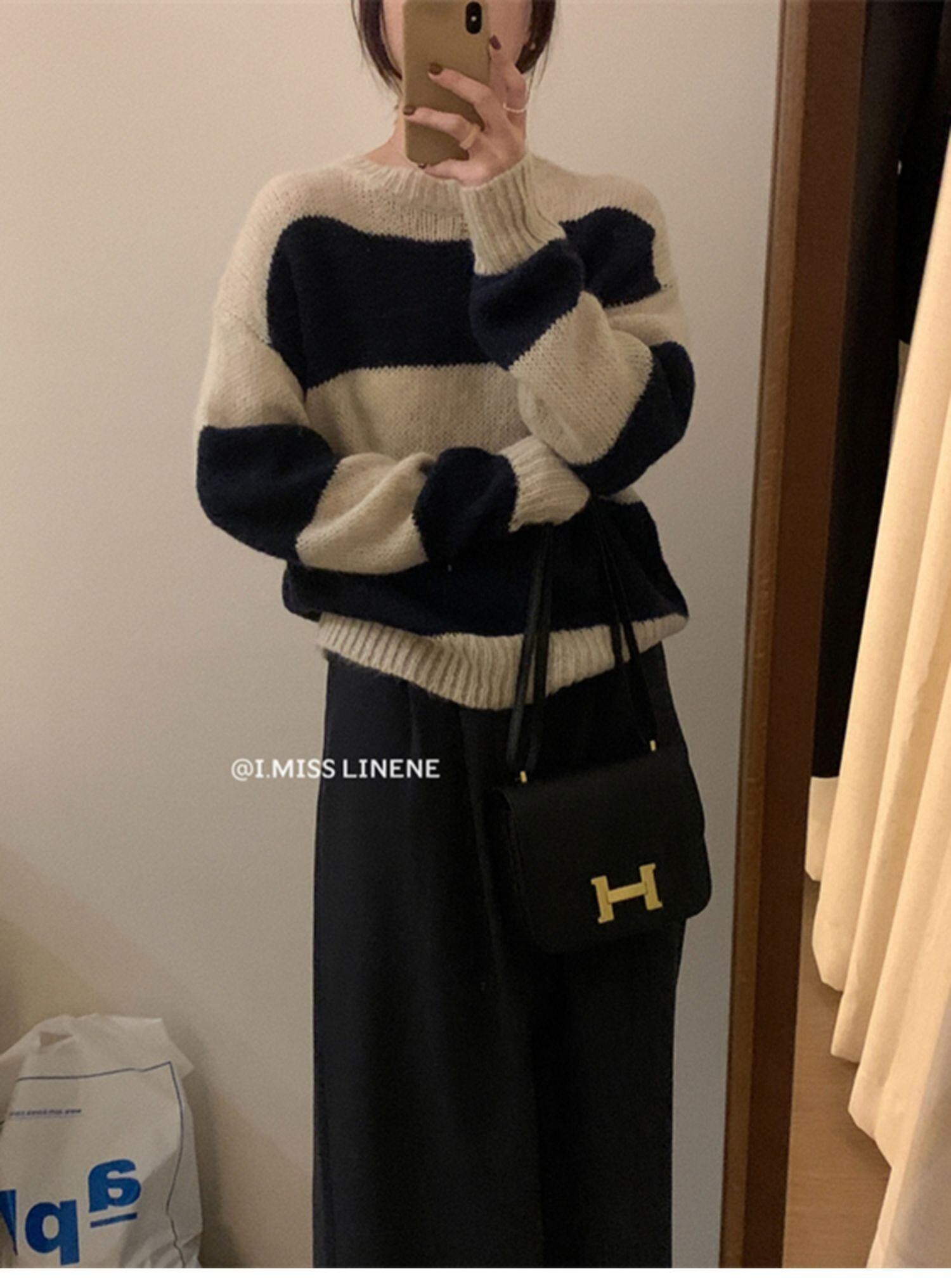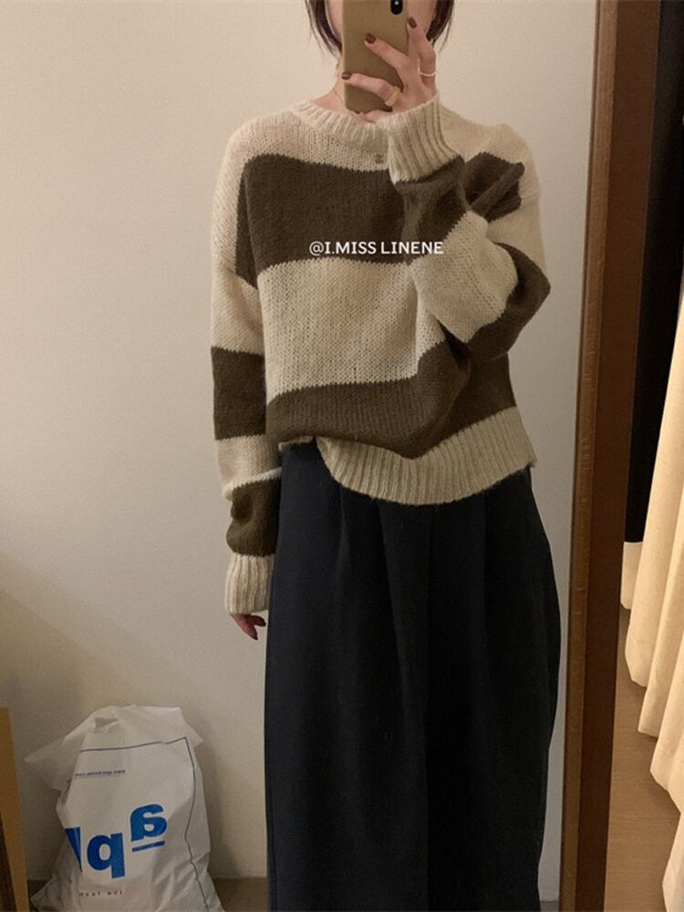 オータムルーズラウンドネックプルオーバー スタンダードストライプセーター ロング レトロ 秋物 Oネック 9/19 秋冬 オータム ウインター ナチュラル mi4626879488481