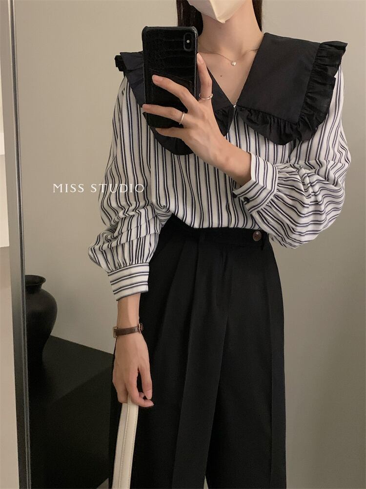 ブレスト長袖スリーブトップス ストライプカラーシャツ ロング 9/19 秋冬 オータム ウインター ナチュラル mi4689111525370