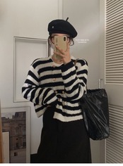 オータムスタイルラウンドネックスリムダブルブレストブラックホワイトストライプセーター 秋物 Oネック 9/19 秋冬 オータム ウインター ナチュラル mi4668072848735
