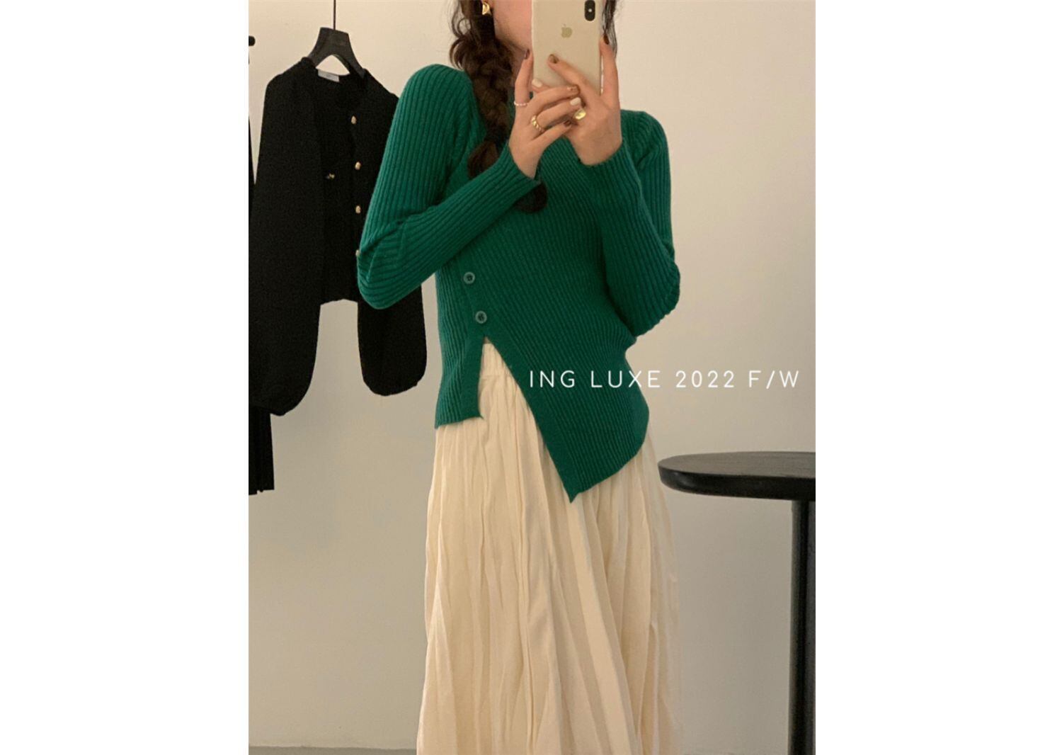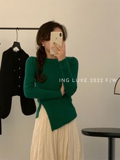 オータム薄手トップス スリットボタンストライプニットセーター ロング 秋物 9/19 秋冬 オータム ウインター ナチュラル mi4622786743240