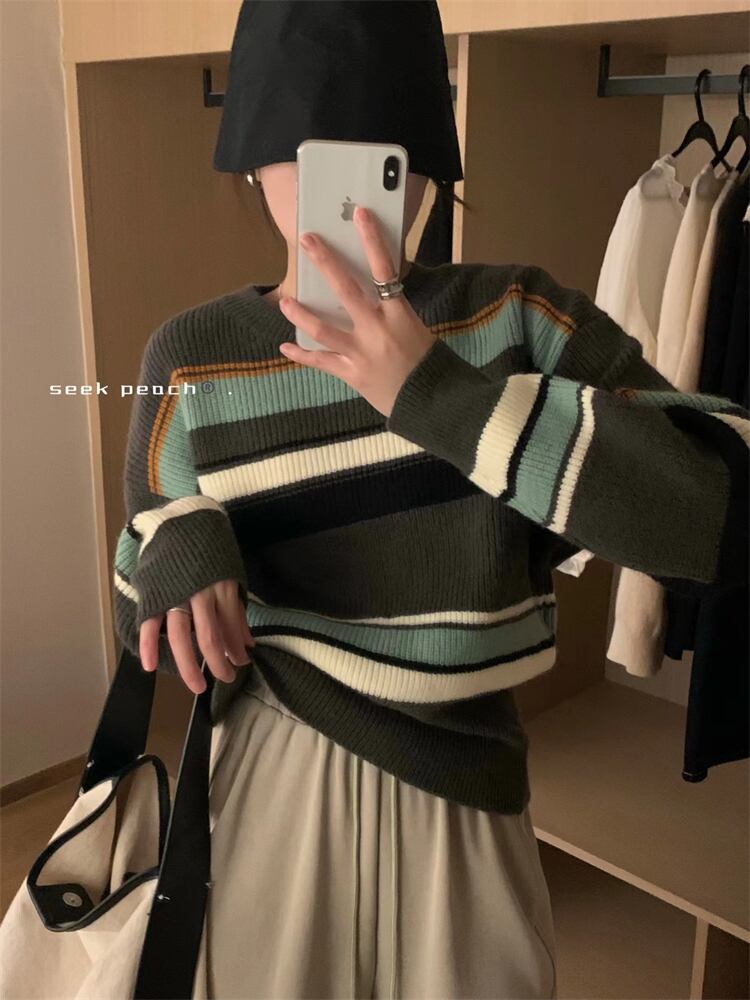 オータムラウンドネックスリムプルオーバー トップス ストライプルーズセーター 秋物 Oネック 9/19 秋冬 オータム ウインター ナチュラル mi4610493498287