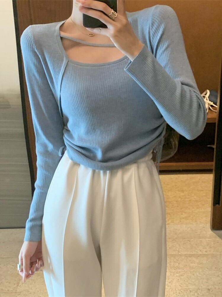 オータムスリムラウンドネックトップス ブルーニットセーター ロング 秋物 Oネック 9/19 秋冬 オータム ウインター ナチュラル mi46344543261