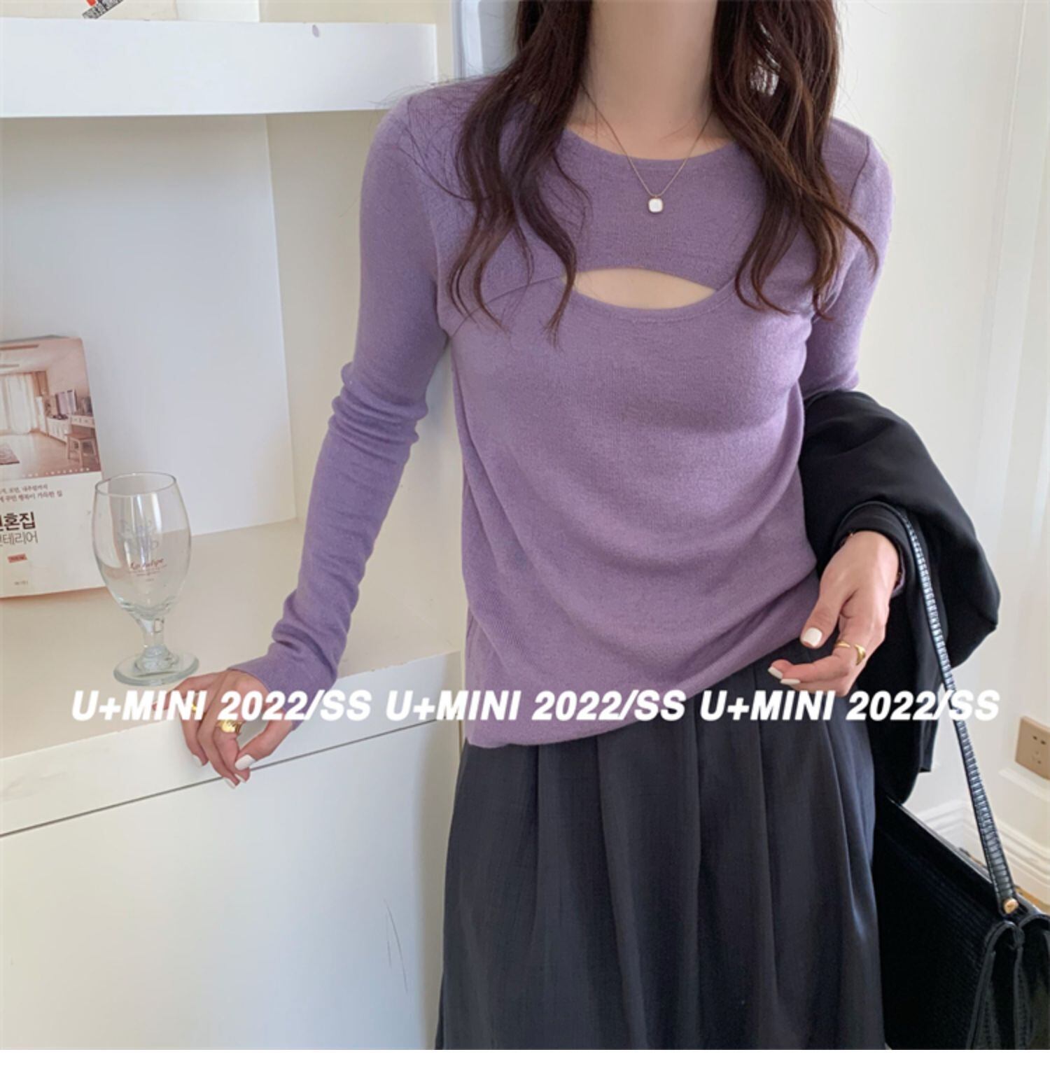 オータムラウンドネックトップス スリム長袖スリーブニット ロング 秋物 Oネック パープル 9/19 秋冬 オータム ウインター ナチュラル mi4683520723282