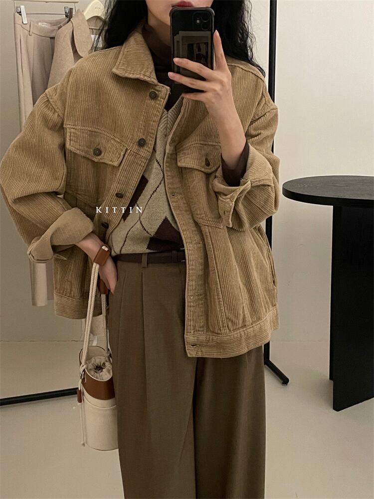 オータムスタンダードルーズコーデュロイショートジャケット レディース ロング レトロ 秋物 9/19 秋冬 オータム ウインター ナチュラル mi467677102813