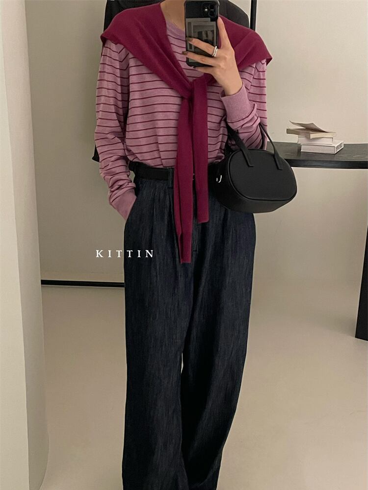オータムストライプラウンドネックセーター ロング 秋物 Oネック 9/19 秋冬 オータム ウインター ナチュラル mi464936740205