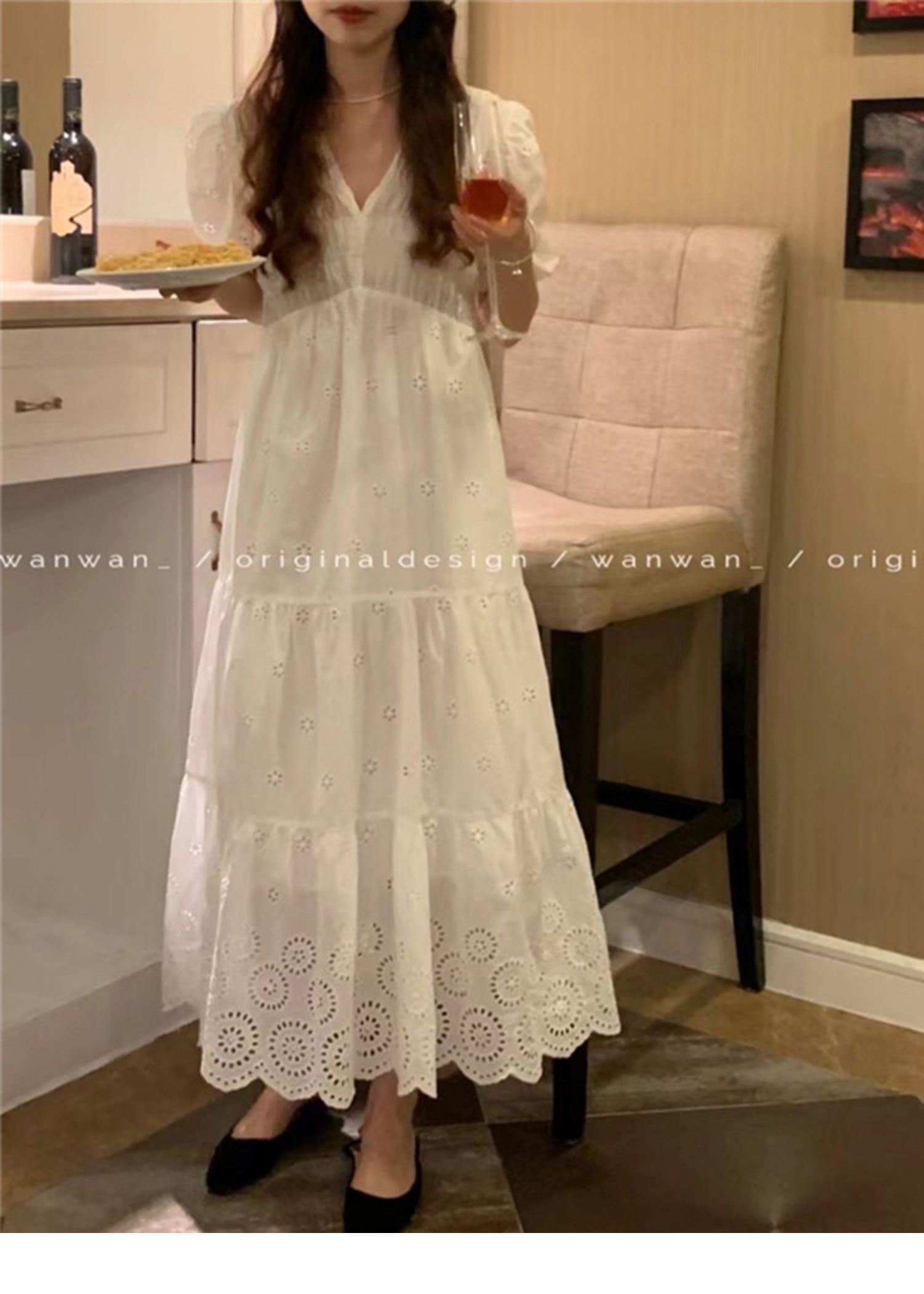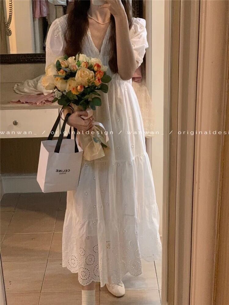 サマーハイウェストウェストVネックホワイトスカート 刺繍ドレス 夏物 9/19 秋冬 オータム ウインター ナチュラル mi4612181583696