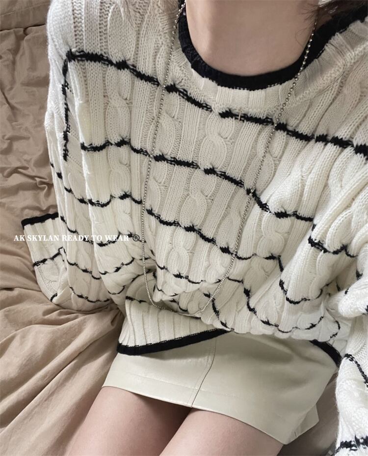 オータムルーズラウンドネックプルオーバー トップス ストライプセーター 秋物 Oネック 9/19 秋冬 オータム ウインター ナチュラル mi4627924513610