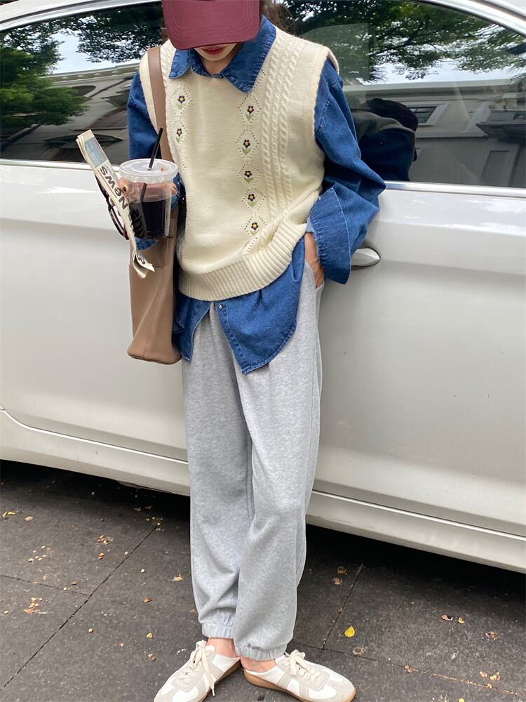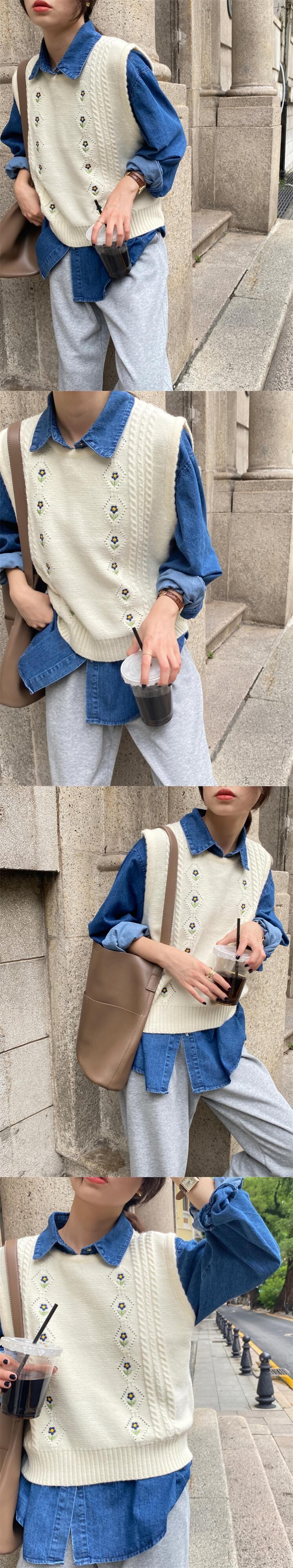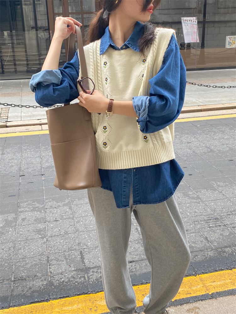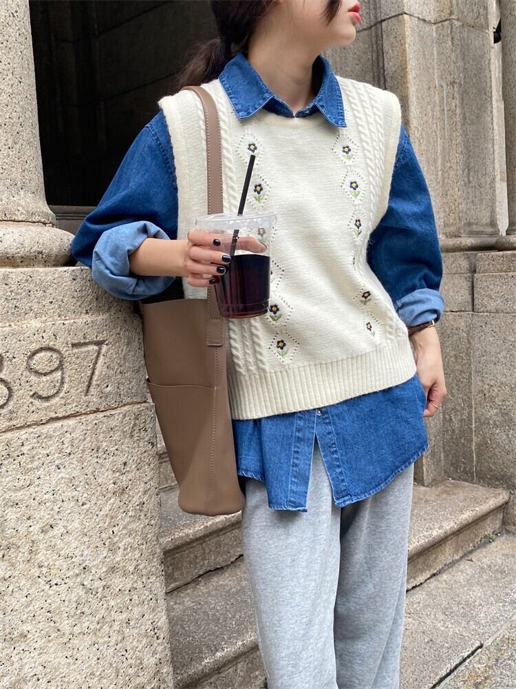 オータムルーズラウンドネックニットセーター Flowerデザイン ノースリーブ レッド 刺繍 秋物 Oネック フラワーデザイン 9/19 秋冬 オータム ウインター ナチュラル mi4613728371298