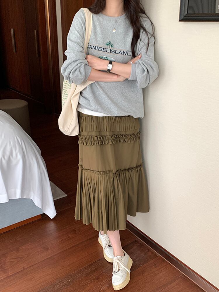 オータムストレッチウェストレースプリーツミディスカート レッドグリーン エラスティック 伸縮 秋物 9/19 秋冬 オータム ウインター ナチュラル mi4674323411279
