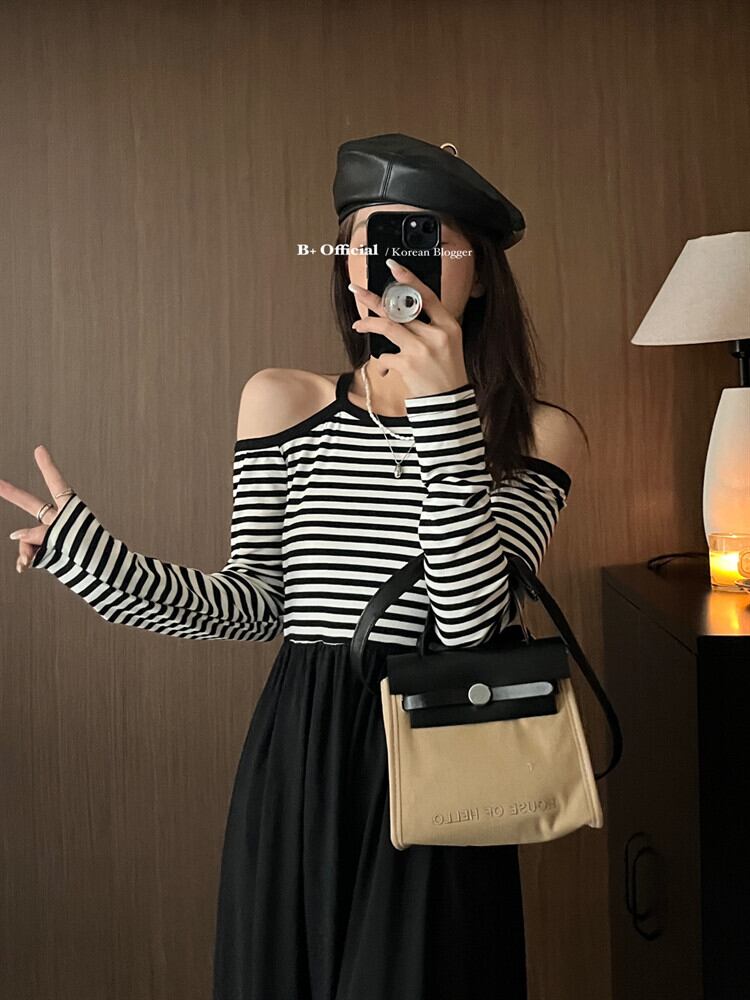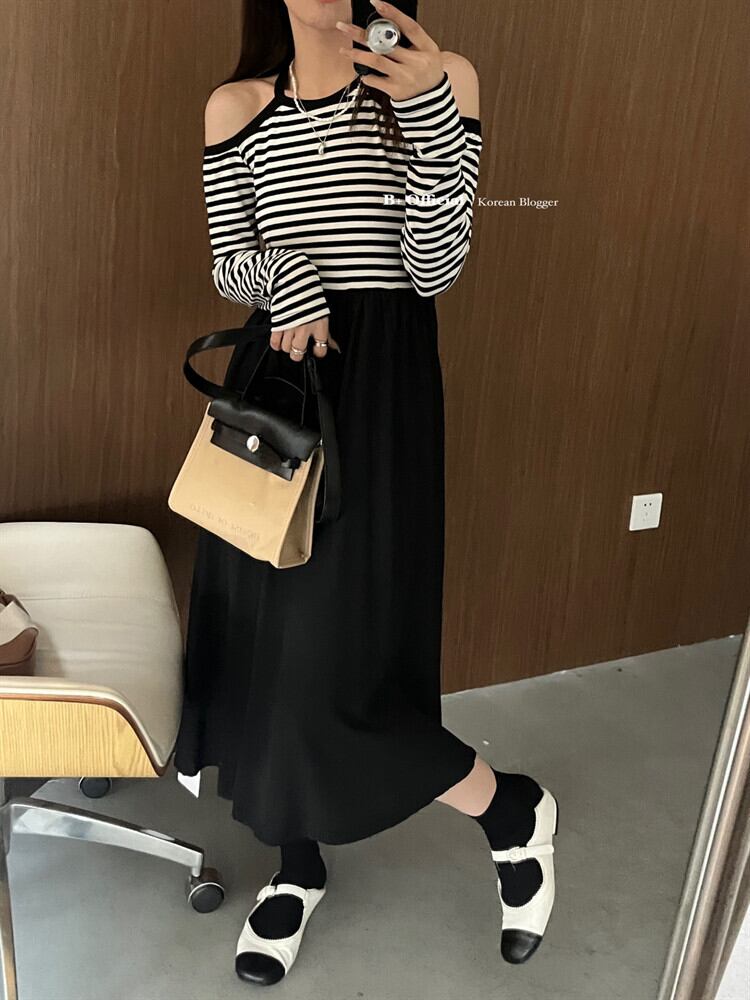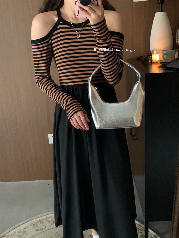 オータムラウンドネックウェストスカート ストライプドレス レディース 秋物 Oネック ステッチ 9/19 秋冬 オータム ウインター ナチュラル mi4693983243328