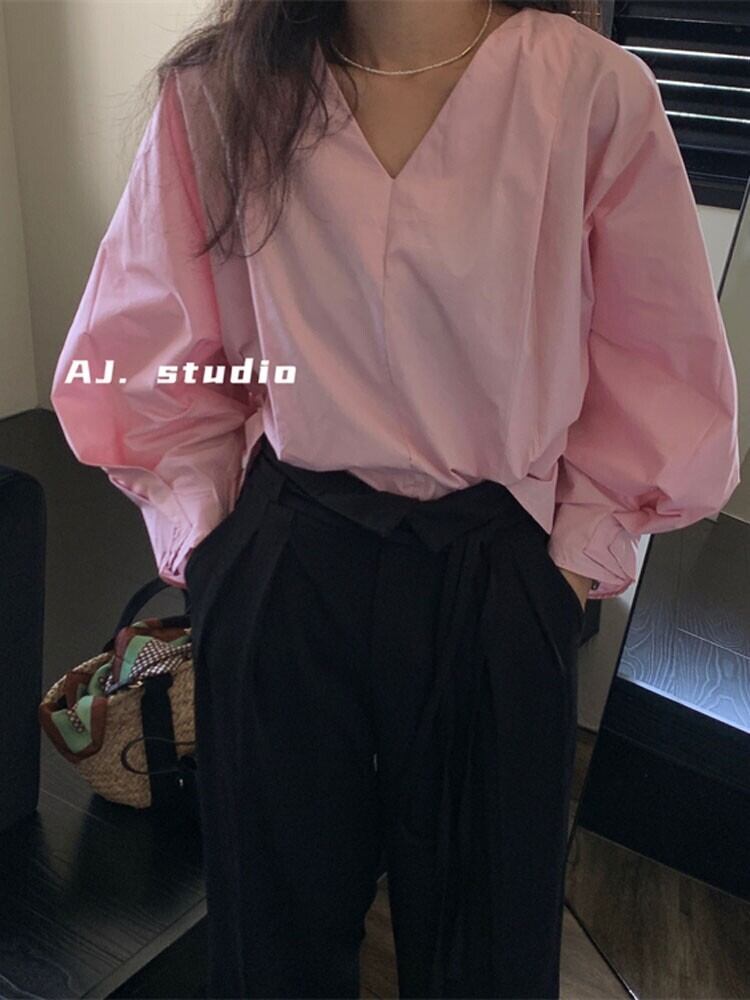 シャツ オータムルーズソリッド カラーVネックトップス ロング 秋物 ソリッドカラー 9/19 秋冬 オータム ウインター ナチュラル mi4625353075720