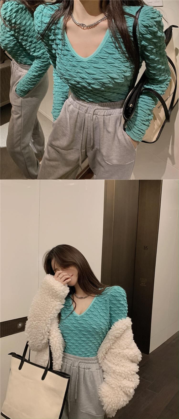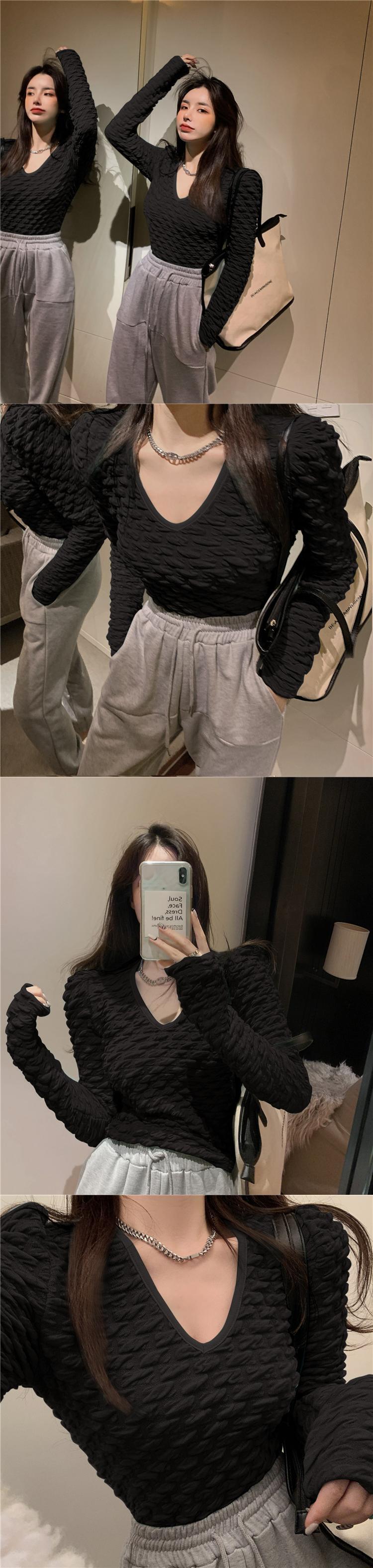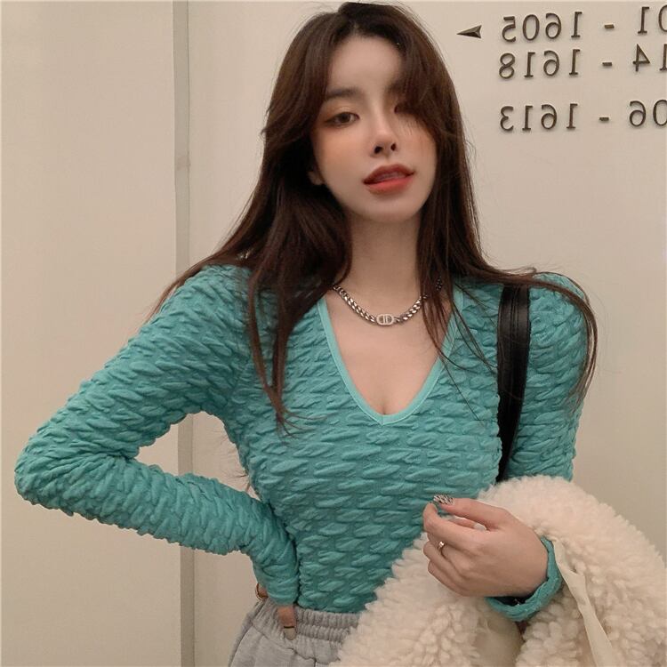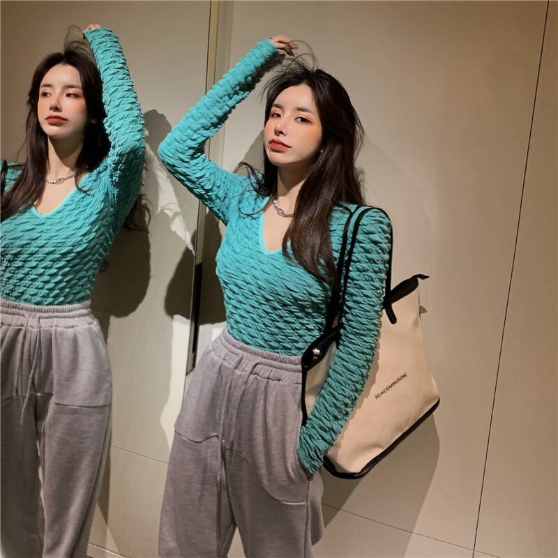 Vネックシャツ オータムスリムフィットTシャツ プリーツショートトップス ロング 秋物 10/5 秋冬 オータム ウインター ナチュラル mi468234516138