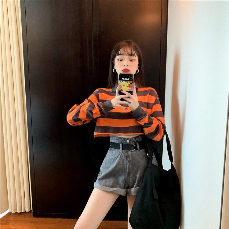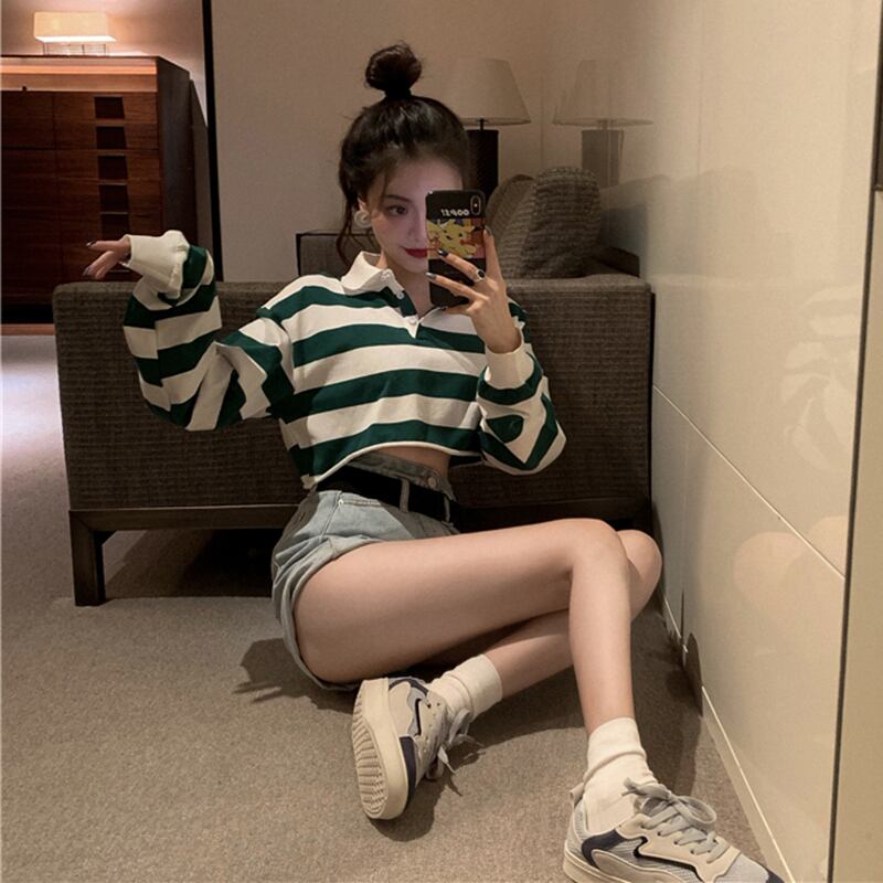 オータムルーズTシャツ シャツ グリーンストライプショートトップス レディース ロング 秋物 10/5 秋冬 オータム ウインター ナチュラル mi4693319394100